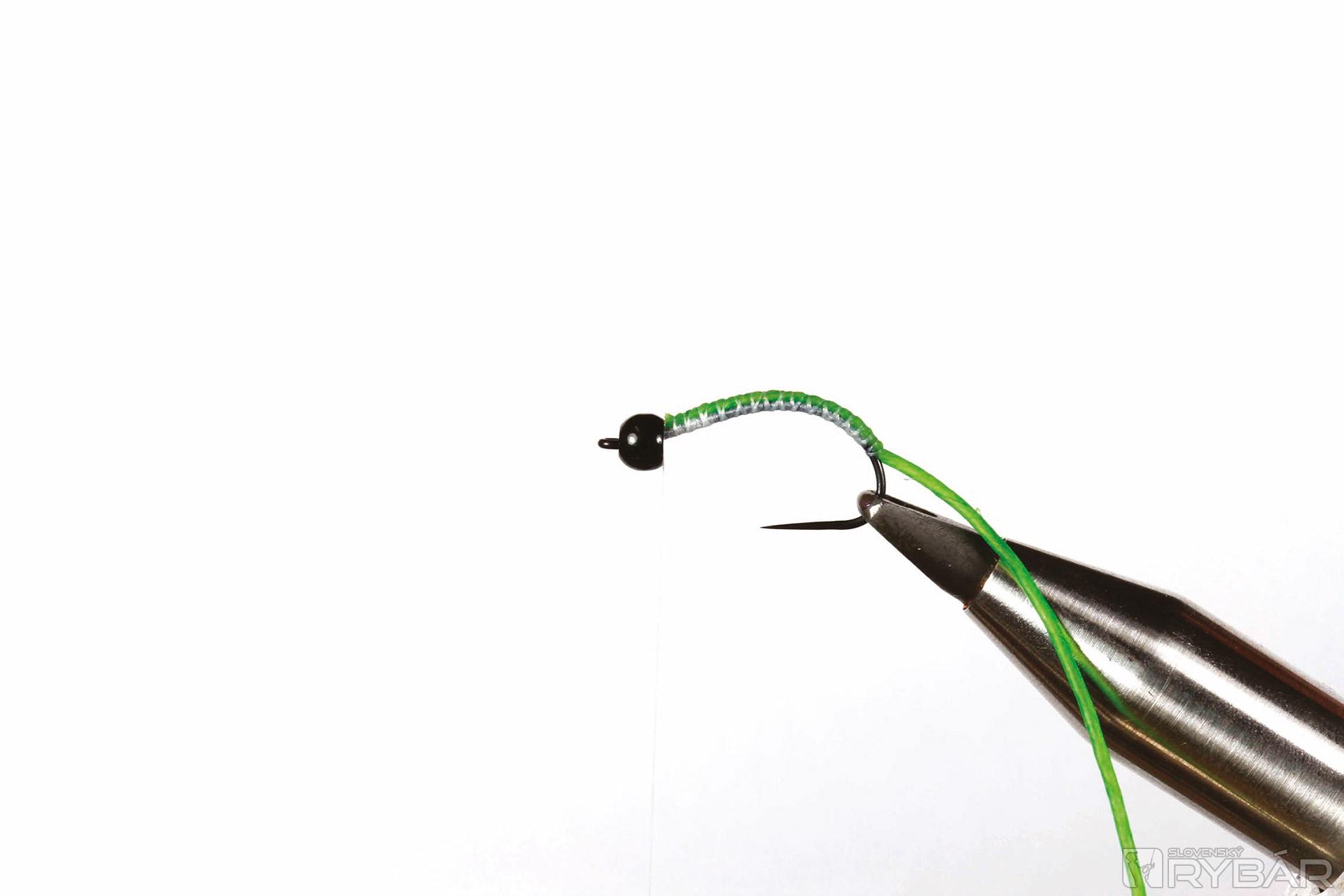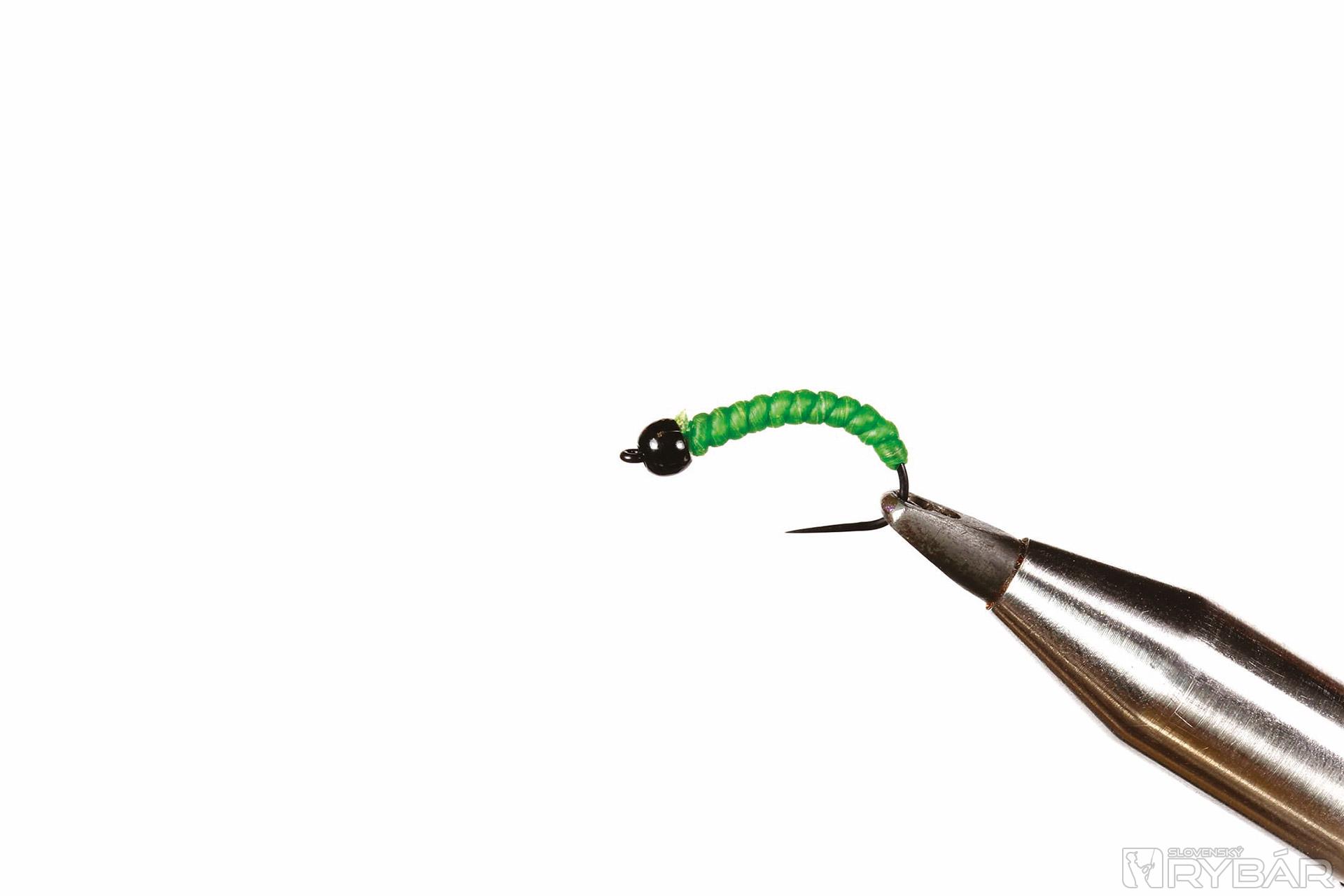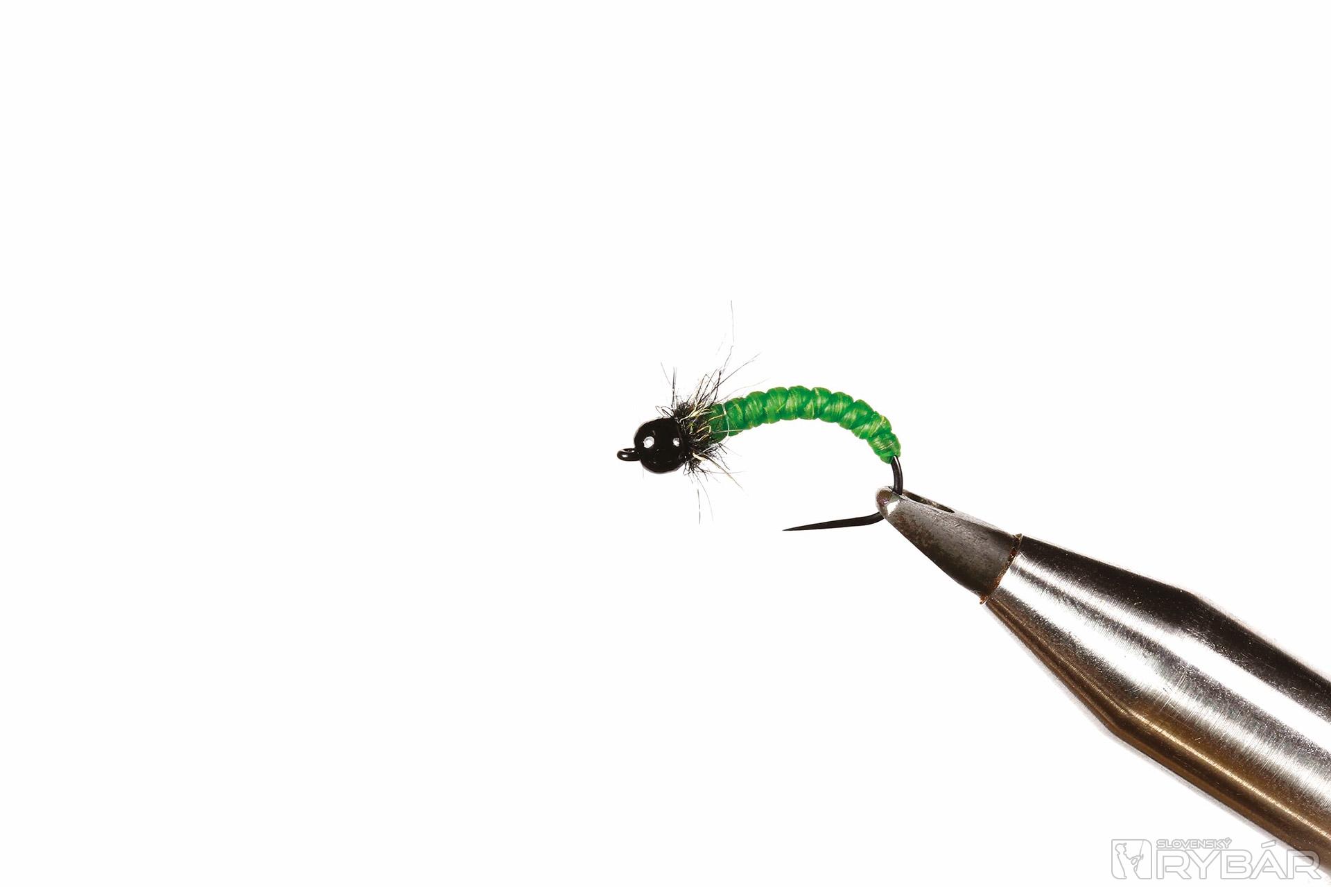 Ďalší potočník, tentoraz nymfa druhu Rhyacophila. Nymfa býva rôzne sfarbená, ale známa je práve táto, sýtozelená. Rhyacophila má výrazne článkované telíčko. Môžeme ho napodobniť rôznymi hrubšími niťami a pod. Ja som mušku zhotovil z materiálu „catgut“. Je to prírodná „struna“, v minulosti sa tento materiál používal naozaj ako struny hudobných nástrojov a získaval sa z čriev zvierat, dokonca sa ním šilo pri operáciách. Catgut je výborný materiál vyrábajúci sa v rôznych farebných odtieňoch, hrúbkach a je stálofarebný. S nymfou lovíme metódou krátkej, alebo dlhej nymfy buď s jednou muškou na nadväzci, alebo v kombinácii s inými muškami, napr. typu Hydropsyche a pod.