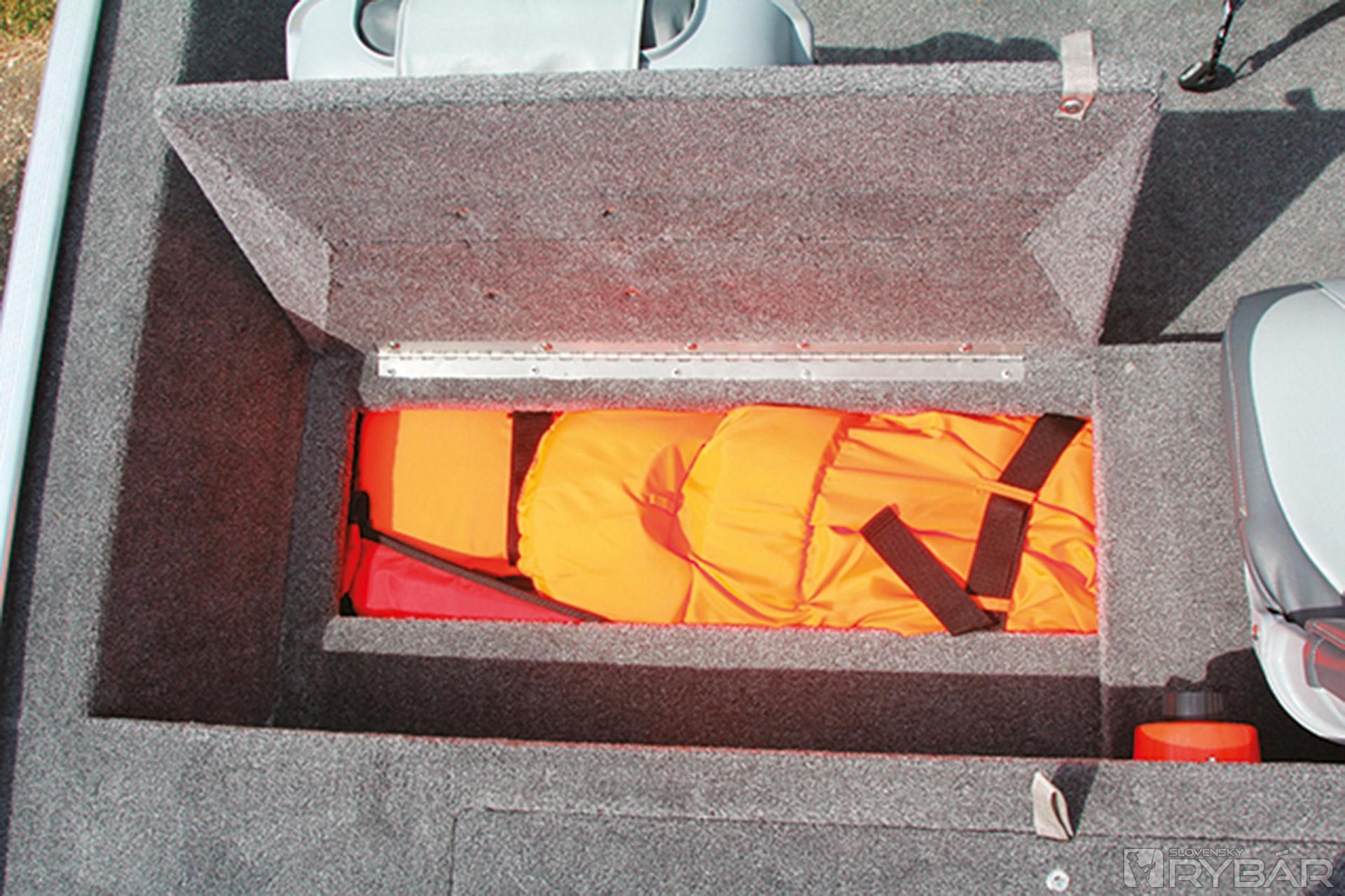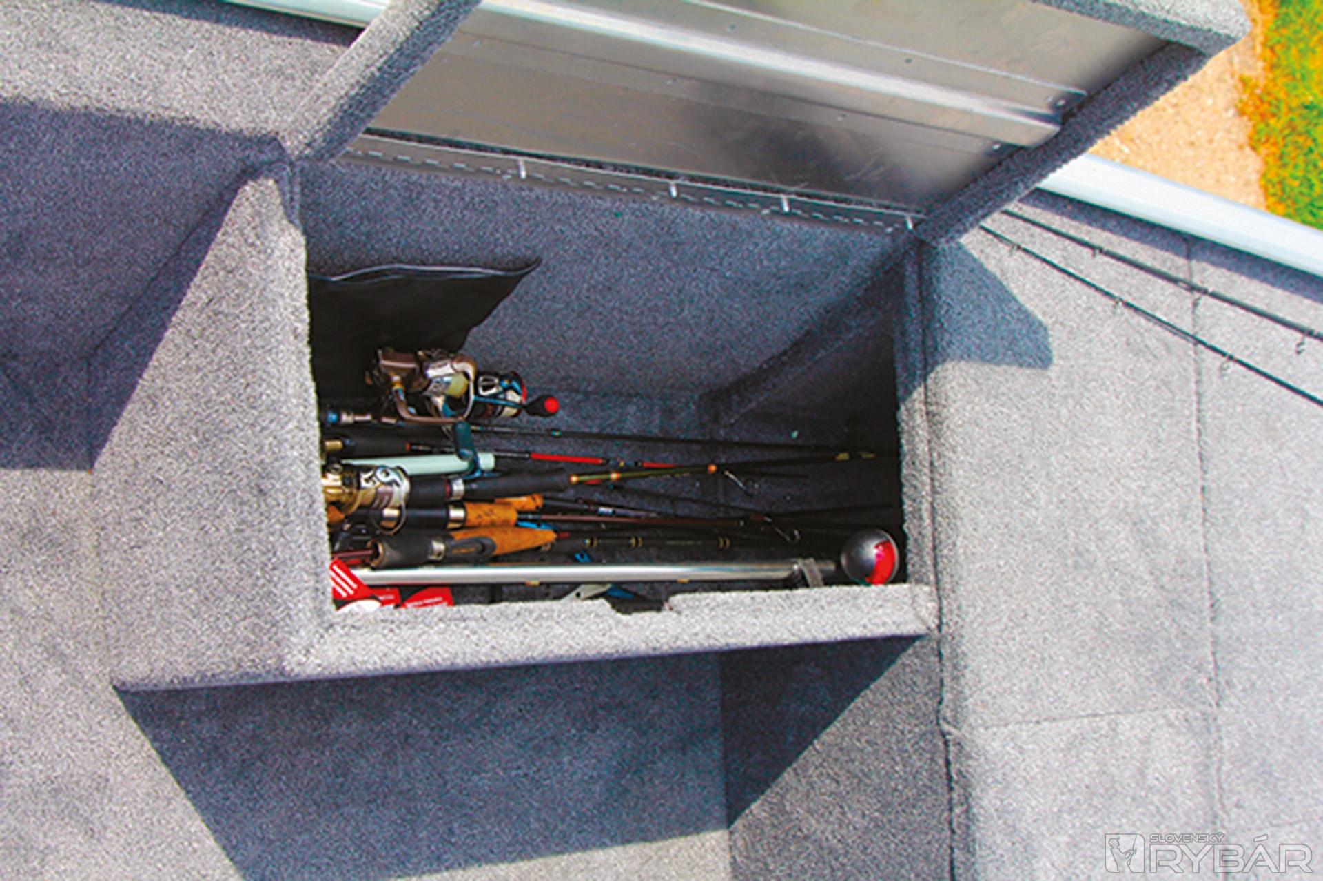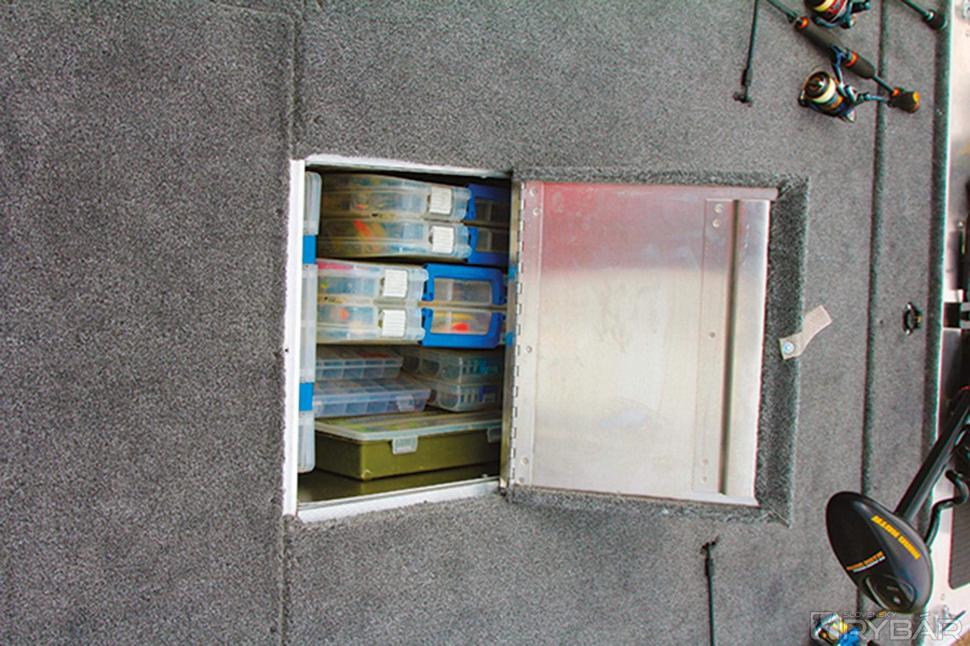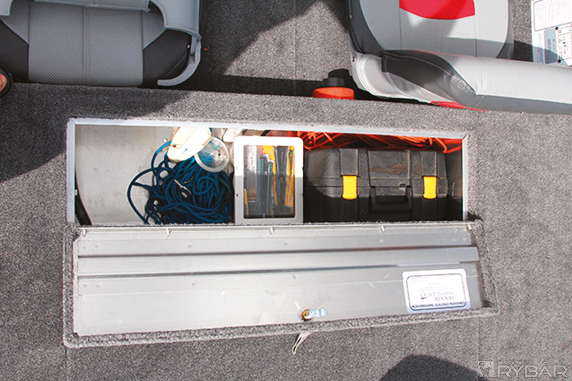 Asi najviac nás presvedčil veľký uzamykateľný box na prúty v ľavej strane člna vysoký 36 cm. Box na prúty bol doménou len drahších modelov. Veď si predstavte: 3-4 rybári a každý po štyri prúty a niektorí pacienti aj po viac… Odkedy jazdíme po rybách s novou 170, v aute máme len osobné veci. Všetko už nosíme v člne. No, ale aby som neodbočil, tak späť k tým novinkám. Okrem boxu na prúty pribudol športový volant, nové budíky na konzole, bočné svetlo, klaksón, napájanie nádrže na benzín, lepší uzáver nádrže a o triedu vyššej 175, sonar Lowrance® Elite-3x COLOR FISHFINDER. Toľko o novinkách na túto sezónu. Okrem spomínaného boxu na prúty je v prednej palube 60-litrová nádrž na ryby a box na nástrahy v prednej palube. Pod sedadlami v úložnom boxe si odkladáme záchranné vesty a lano. Za sedadlami sa začína zadná paluba v rovnakej výške ako predná. Hneď po ruke je veľký box na príslušenstvo, do ktorého sa dostanete aj keď sedíte za volantom. Za ním je už len box s baterkami a nádrž.