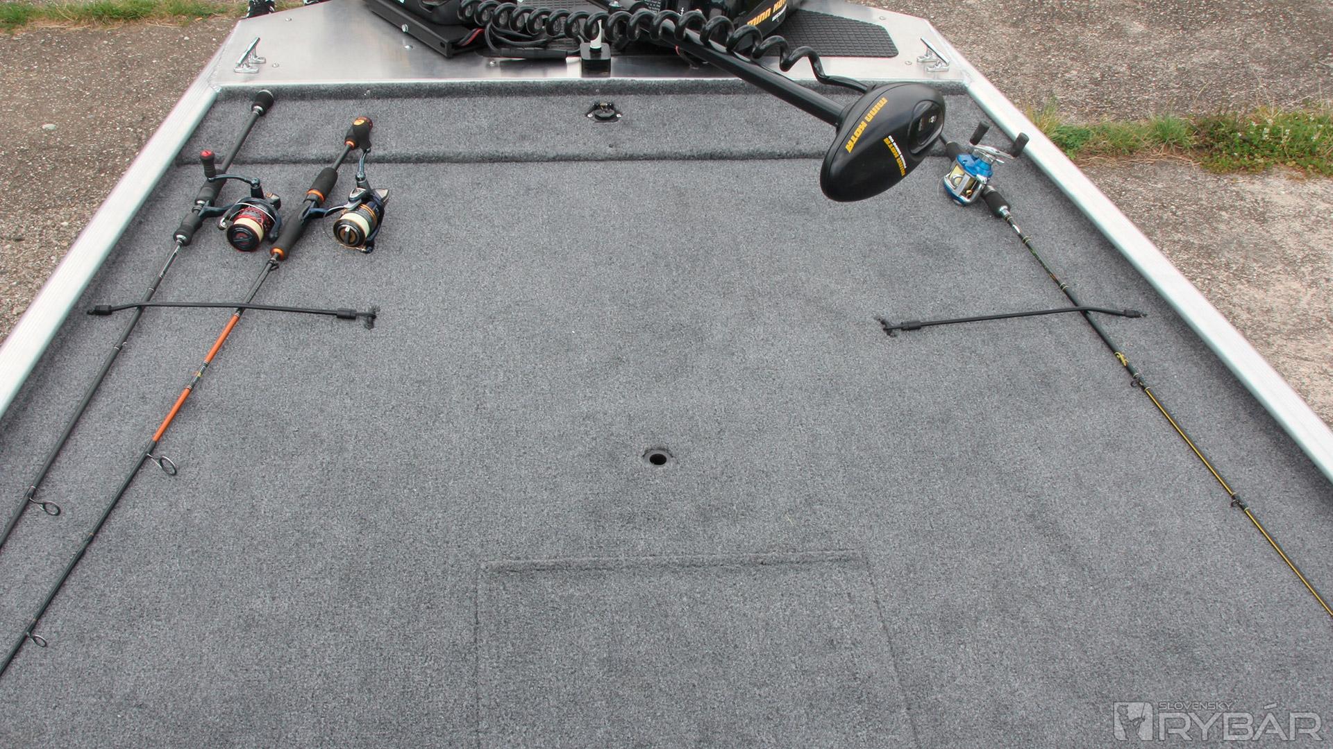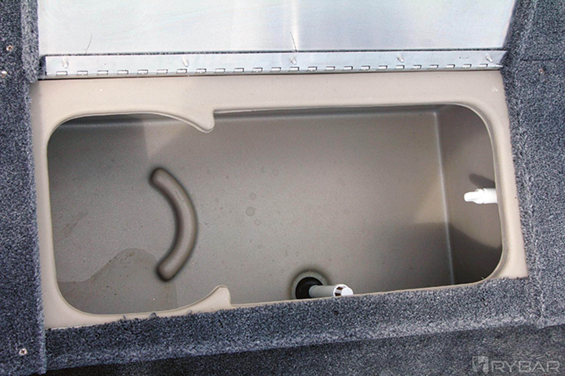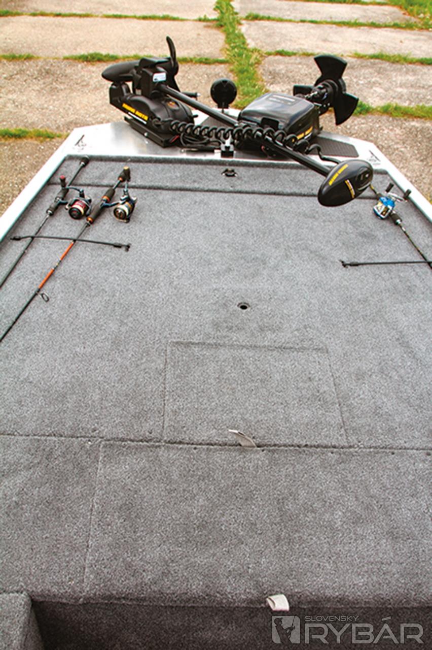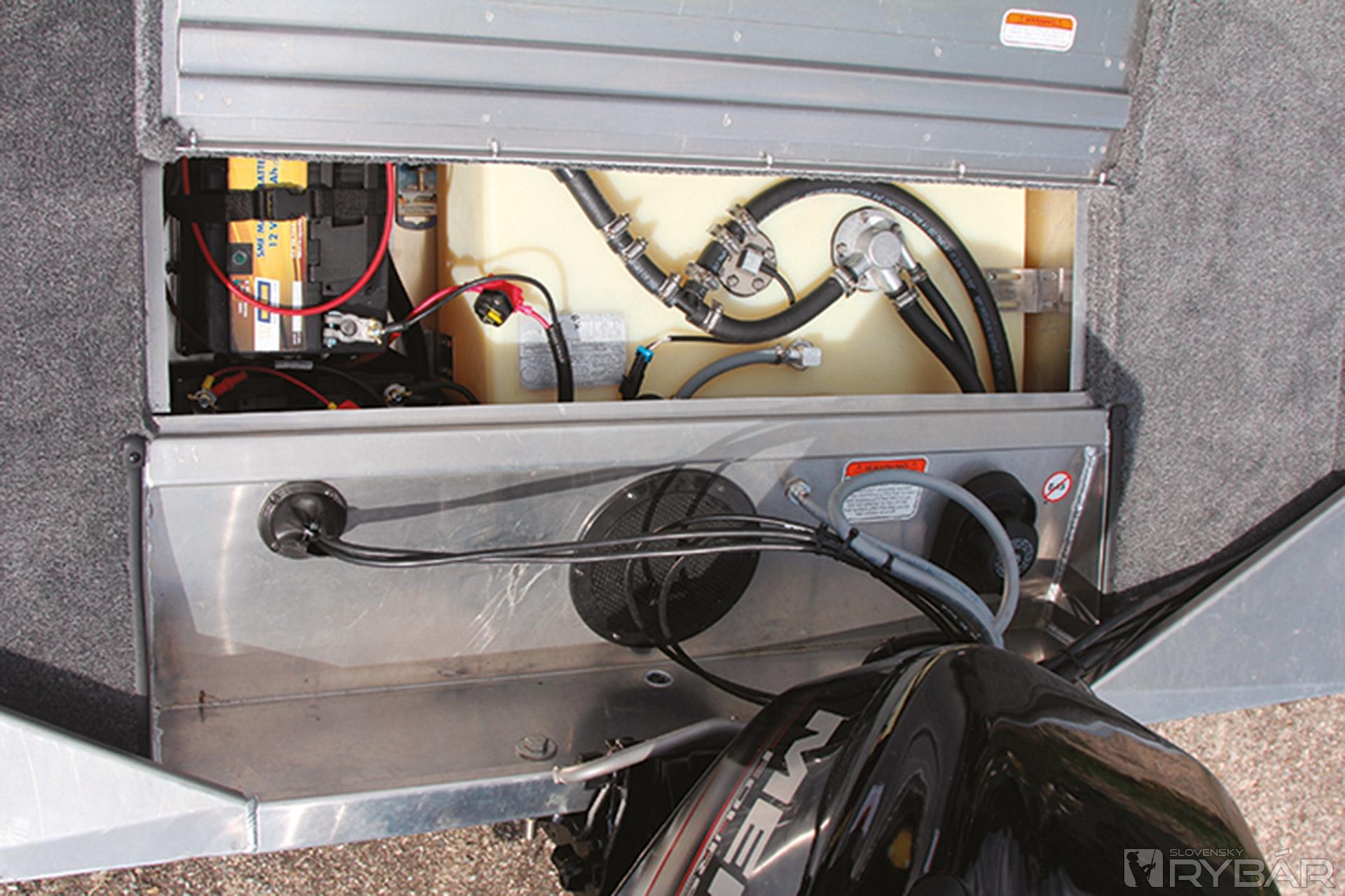 Asi najviac nás presvedčil veľký uzamykateľný box na prúty v ľavej strane člna vysoký 36 cm. Box na prúty bol doménou len drahších modelov. Veď si predstavte: 3-4 rybári a každý po štyri prúty a niektorí pacienti aj po viac… Odkedy jazdíme po rybách s novou 170, v aute máme len osobné veci. Všetko už nosíme v člne. No, ale aby som neodbočil, tak späť k tým novinkám. Okrem boxu na prúty pribudol športový volant, nové budíky na konzole, bočné svetlo, klaksón, napájanie nádrže na benzín, lepší uzáver nádrže a o triedu vyššej 175, sonar Lowrance® Elite-3x COLOR FISHFINDER. Toľko o novinkách na túto sezónu. Okrem spomínaného boxu na prúty je v prednej palube 60-litrová nádrž na ryby a box na nástrahy v prednej palube. Pod sedadlami v úložnom boxe si odkladáme záchranné vesty a lano. Za sedadlami sa začína zadná paluba v rovnakej výške ako predná. Hneď po ruke je veľký box na príslušenstvo, do ktorého sa dostanete aj keď sedíte za volantom. Za ním je už len box s baterkami a nádrž.