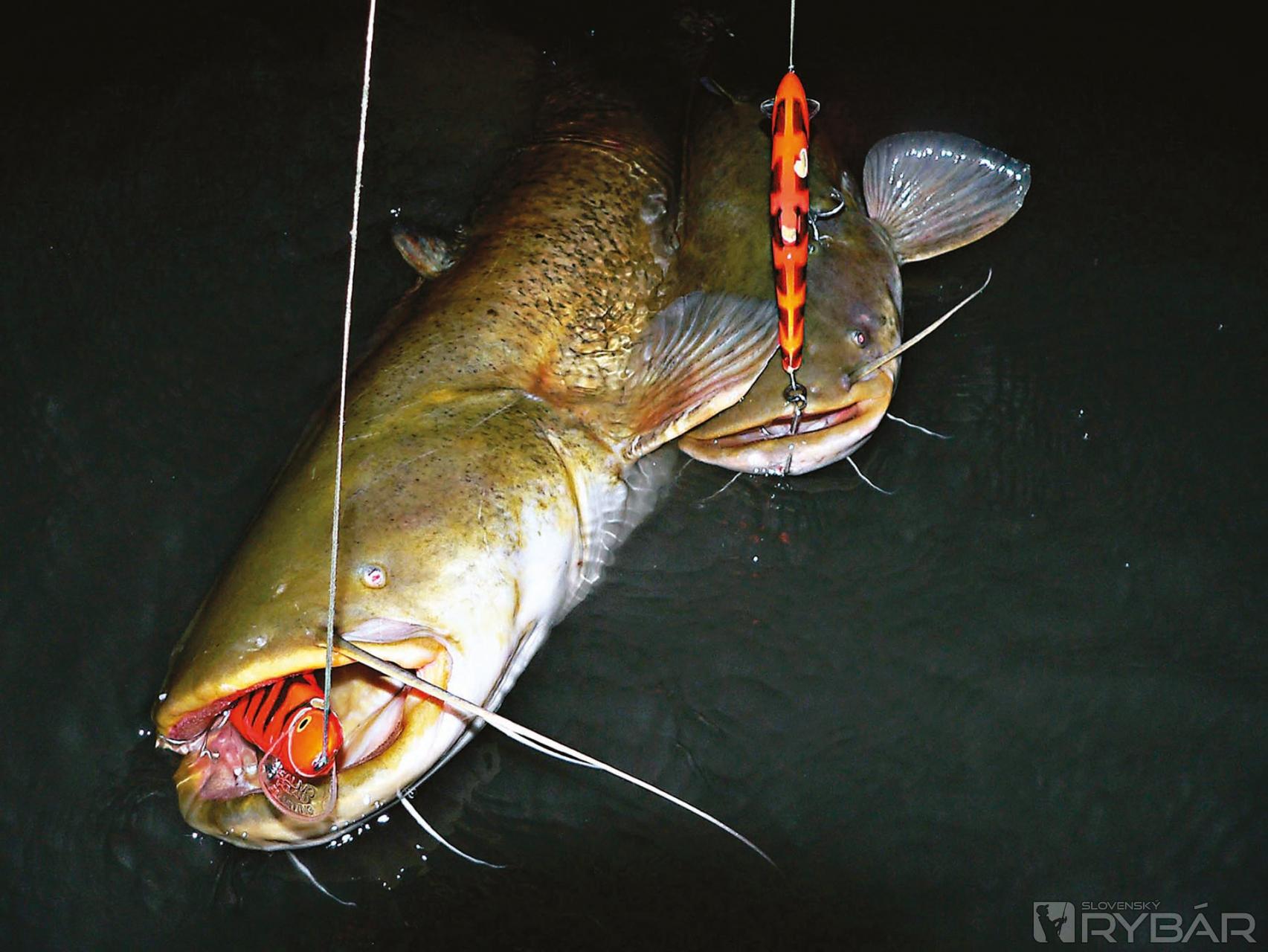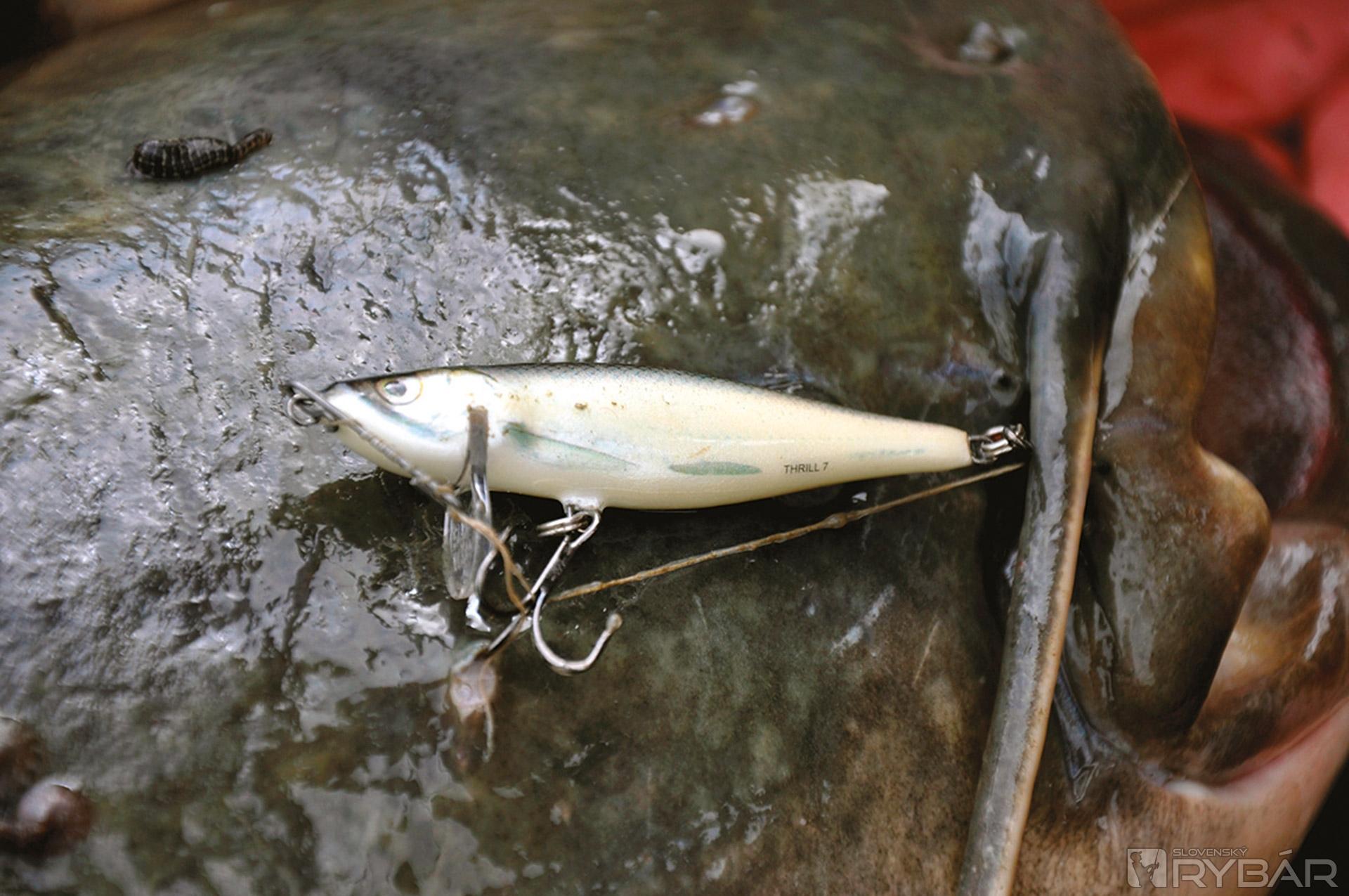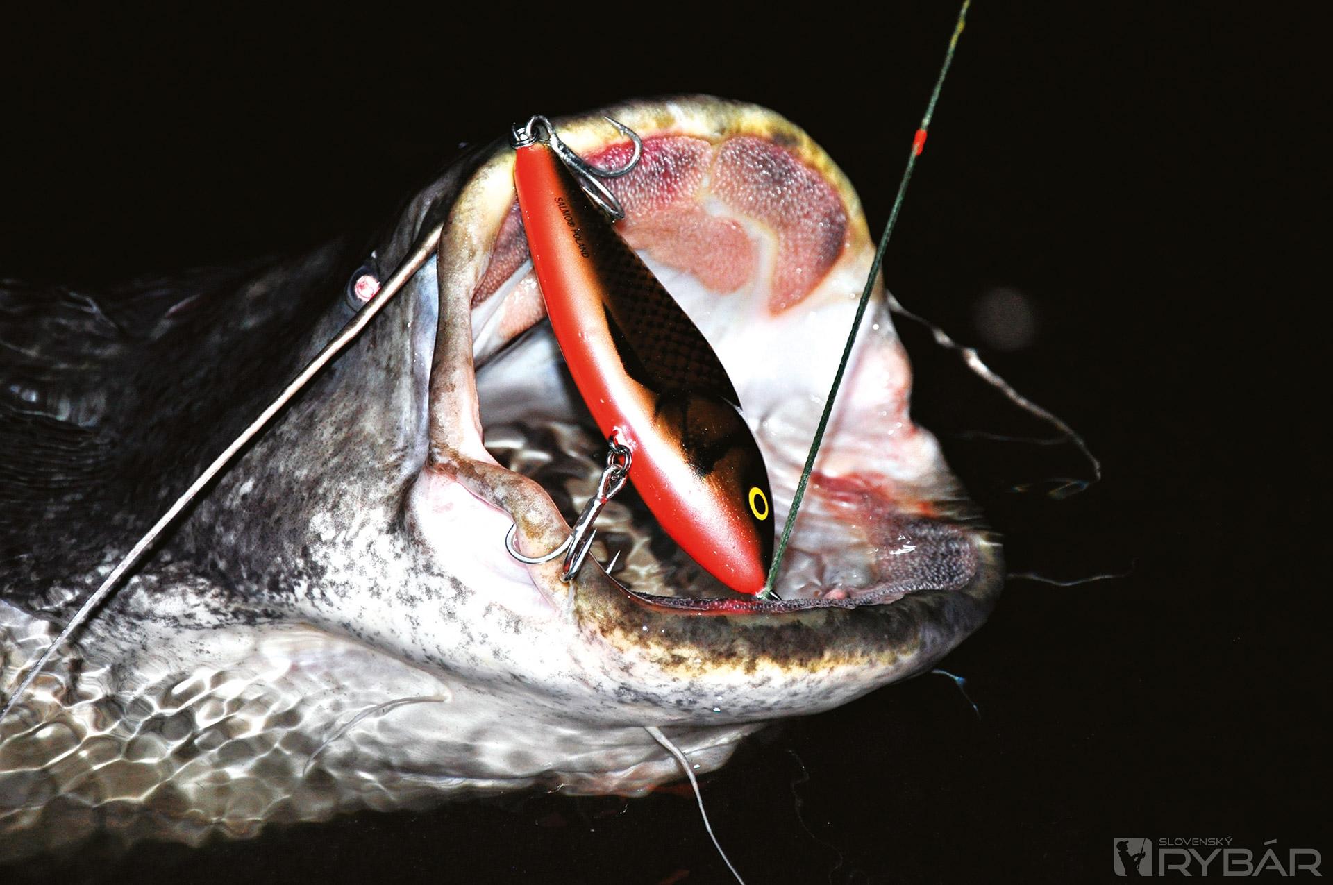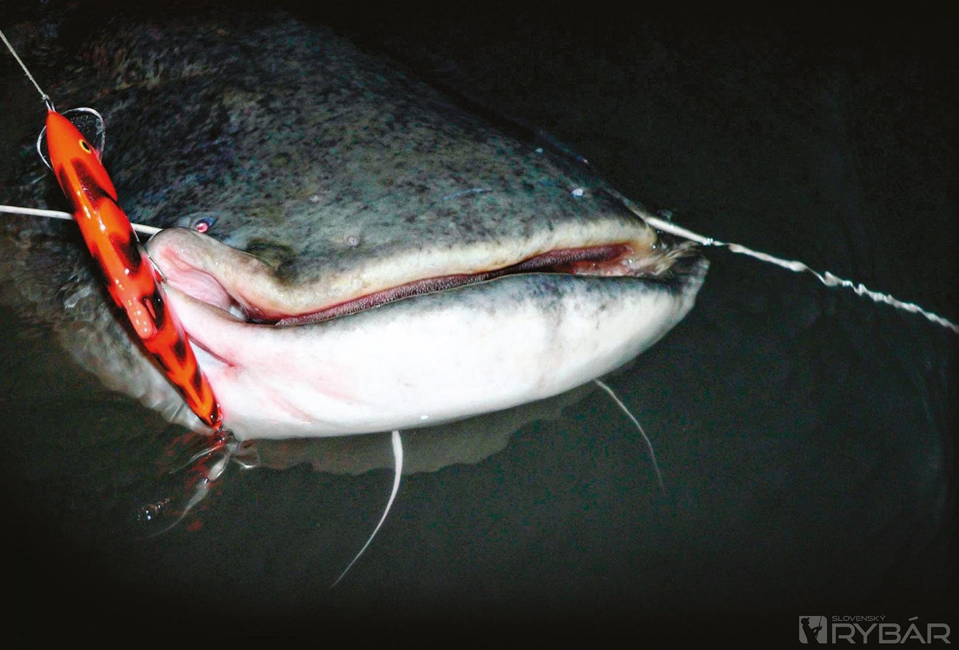 Ďalej pozorujeme povrch vody a snažíme sa loviť v miestach, kde sa tvoria rozľahlé víry. Na týchto flekoch môže byť aj niekoľko sumcov rovnakej veľkosti. V takejto vode je lepšie použiť väčšie nástrahy (15 cm). Mojimi obľúbenými sú voblery. Rôznorodosť ich vyhotovenia, rozmerov a typov umožňujú dobre sa trafiť do chutí sumcov. Nie všetky sa však hodia. Ale je jeden, ktorý je od začiatku jeho výroby veľmi vhodný na lov fúzatých potvor. Je to Salmo Hornet 9 cm. Naprojektovaný bol v spolupráci s najlepšími lovcami sumcov. Je vyhotovený veľmi solídne a má dosť silné krúžky a háčiky. Problém pramení z veľkej sily sumčích čeľustí, ktoré dokážu narovnať háčiky, rozbiť aj silnú konštrukciu voblera a z balzového voblera urobiť triesky. Každý z týchto prípadov končí stratou ryby. Voblery na sumce musia byť vyhotovené zo silného plastu alebo peny a jeho telom musí prechádzať silný drôt. Pena okrem toho nedovoľuje vniknutie vody, a tak si vobler zachováva svoje plávajúce schopnosti. S kolegami sme testovali mnoho veľkých voblerov a aj keď na mnohé z nich brali sumce, veľa ich „neprežilo“ ťah v čeľustiach dravca. Mojimi favoritmi sú produkty od firmy Salmo. Osvedčili sa mi neveľké nástrahy ako Boxer 4 cm, stredné veľkosti Whitefish 13JDR, ako aj veľké Skinnery 20 cm. Možno to bude znieť neuveriteľne, ale objavil som skvelú sumcovú nástrahu – Salmo Thrill! Je to vobler najmä na bolene, prvý sumcový záber som bral ako náhodu, ale celú nasledujúcu sezónu som odlovil sumce na Thrill 9 cm a jeho silu mi potvrdili aj úlovky nad 40 kg! Slabým článkom takmer všetkých voblerov sú krúžky a háčiky. Nie je to však neriešiteľný problém. Po mnohých testoch som dospel k názoru, že vynikajúce krúžky sú Predatek a háčiky Owner 41BC. Avšak každá modifikácia voblera musí byť premyslená, aby neovplyvnila jeho chod. Ak by sme na malú nástrahu naložili veľké a ťažké háčiky, zničili by sme jej prácu. Po každom tuningu by sme mali prácu voblera najprv otestovať. Farba nástrah, ako som už spomínal, nemá veľký vplyv. Dobre však fungujú fluo farby, alebo rôzne kontrastné ako Red Tiger, Green Tiger, ktoré sú dobre viditeľné v podmienkach slabého osvetlenia. Osvedčili sa mi v takých podmienkach aj také voblery, ktoré sú maľované luminiscenčnou farbou – teda takou, ktorá v tme svieti po nasvietení baterkou. Lepšia viditeľnosť nástrah v noci sa prejaví aj na lepších nahodeniach, prezentácii, a teda aj na ich úspešnosti.
