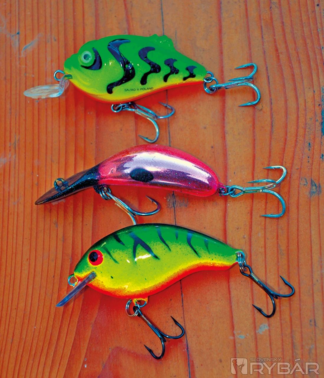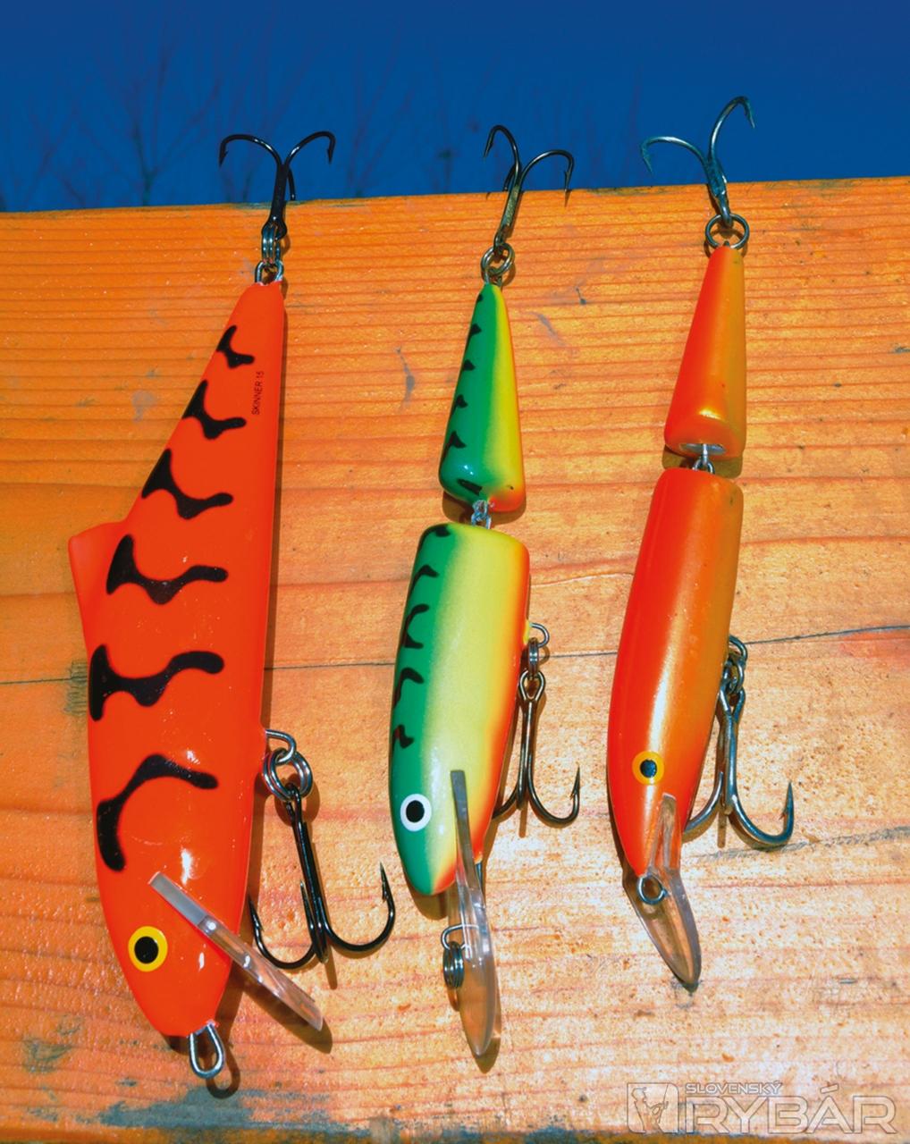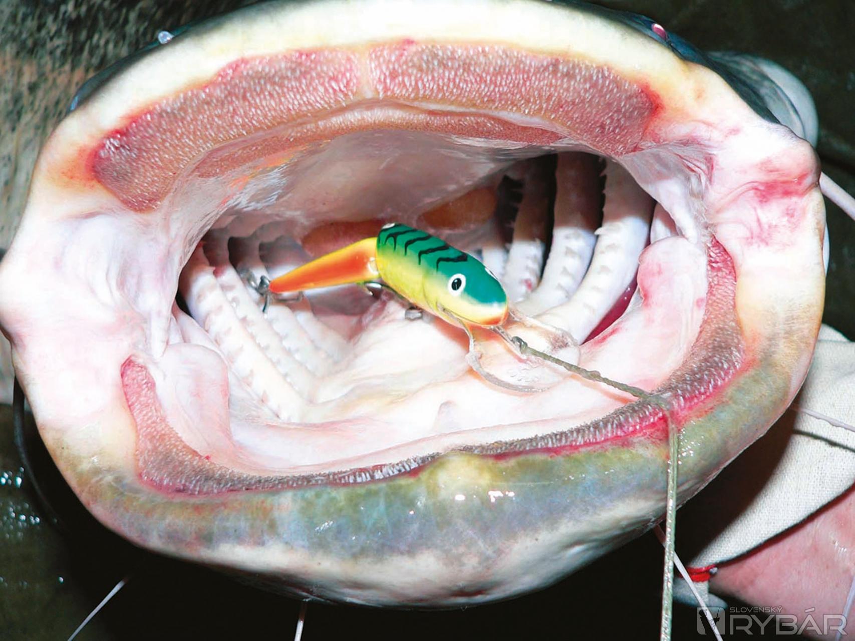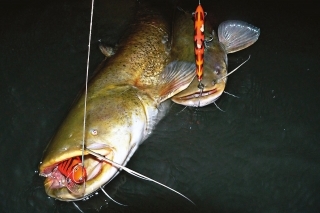 Ďalej pozorujeme povrch vody a snažíme sa loviť v miestach, kde sa tvoria rozľahlé víry. Na týchto flekoch môže byť aj niekoľko sumcov rovnakej veľkosti. V takejto vode je lepšie použiť väčšie nástrahy (15 cm). Mojimi obľúbenými sú voblery. Rôznorodosť ich vyhotovenia, rozmerov a typov umožňujú dobre sa trafiť do chutí sumcov. Nie všetky sa však hodia. Ale je jeden, ktorý je od začiatku jeho výroby veľmi vhodný na lov fúzatých potvor. Je to Salmo Hornet 9 cm. Naprojektovaný bol v spolupráci s najlepšími lovcami sumcov. Je vyhotovený veľmi solídne a má dosť silné krúžky a háčiky. Problém pramení z veľkej sily sumčích čeľustí, ktoré dokážu narovnať háčiky, rozbiť aj silnú konštrukciu voblera a z balzového voblera urobiť triesky. Každý z týchto prípadov končí stratou ryby. Voblery na sumce musia byť vyhotovené zo silného plastu alebo peny a jeho telom musí prechádzať silný drôt. Pena okrem toho nedovoľuje vniknutie vody, a tak si vobler zachováva svoje plávajúce schopnosti. S kolegami sme testovali mnoho veľkých voblerov a aj keď na mnohé z nich brali sumce, veľa ich „neprežilo“ ťah v čeľustiach dravca. Mojimi favoritmi sú produkty od firmy Salmo. Osvedčili sa mi neveľké nástrahy ako Boxer 4 cm, stredné veľkosti Whitefish 13JDR, ako aj veľké Skinnery 20 cm. Možno to bude znieť neuveriteľne, ale objavil som skvelú sumcovú nástrahu – Salmo Thrill! Je to vobler najmä na bolene, prvý sumcový záber som bral ako náhodu, ale celú nasledujúcu sezónu som odlovil sumce na Thrill 9 cm a jeho silu mi potvrdili aj úlovky nad 40 kg! Slabým článkom takmer všetkých voblerov sú krúžky a háčiky. Nie je to však neriešiteľný problém. Po mnohých testoch som dospel k názoru, že vynikajúce krúžky sú Predatek a háčiky Owner 41BC. Avšak každá modifikácia voblera musí byť premyslená, aby neovplyvnila jeho chod. Ak by sme na malú nástrahu naložili veľké a ťažké háčiky, zničili by sme jej prácu. Po každom tuningu by sme mali prácu voblera najprv otestovať. Farba nástrah, ako som už spomínal, nemá veľký vplyv. Dobre však fungujú fluo farby, alebo rôzne kontrastné ako Red Tiger, Green Tiger, ktoré sú dobre viditeľné v podmienkach slabého osvetlenia. Osvedčili sa mi v takých podmienkach aj také voblery, ktoré sú maľované luminiscenčnou farbou – teda takou, ktorá v tme svieti po nasvietení baterkou. Lepšia viditeľnosť nástrah v noci sa prejaví aj na lepších nahodeniach, prezentácii, a teda aj na ich úspešnosti.