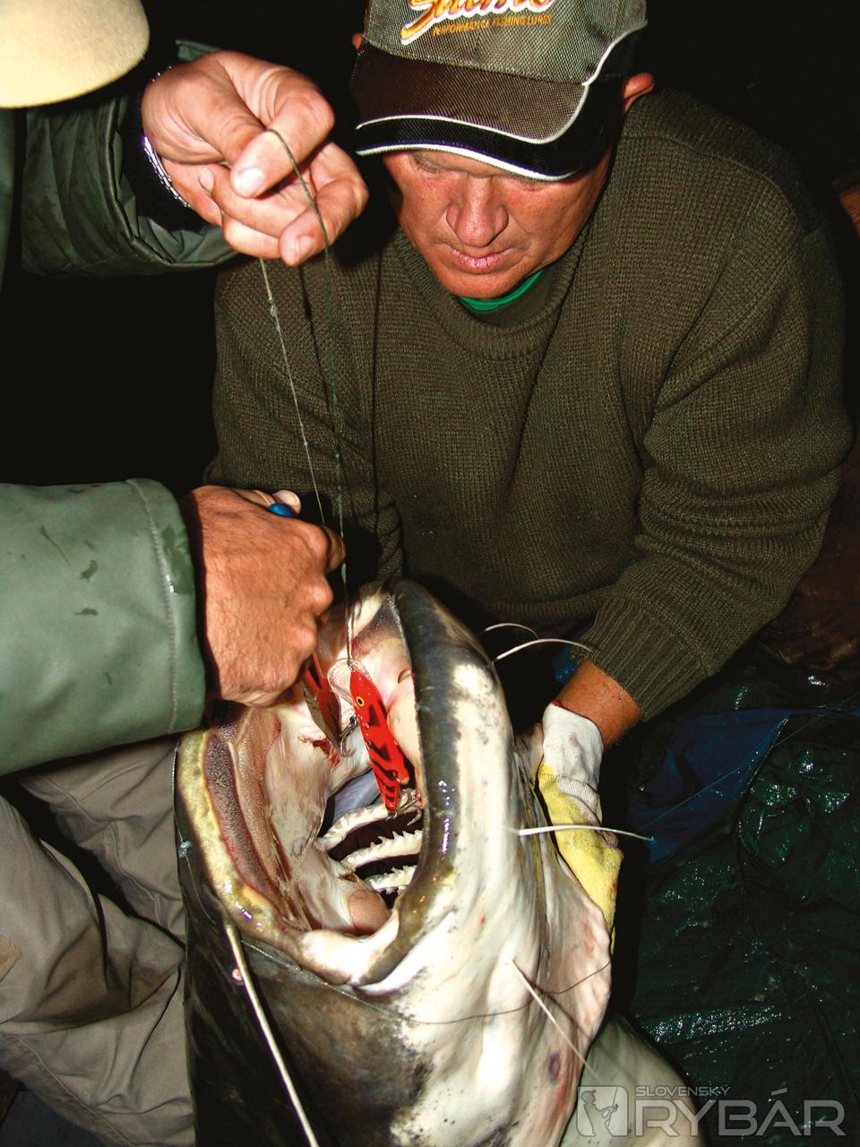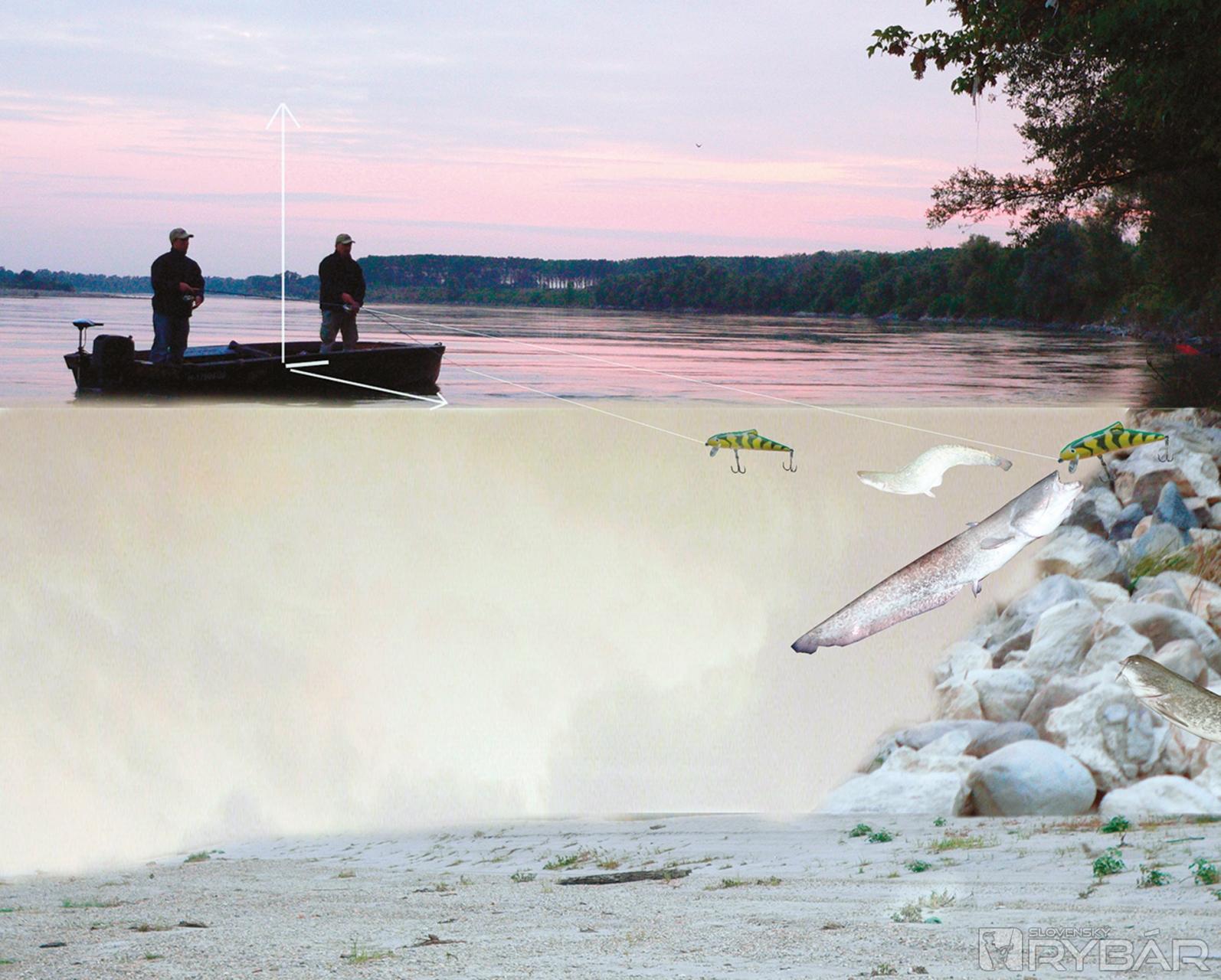 Ako hádzať presne ku brehu, keď je čierna noc? Aj tu sa nájde riešenie. V čistej vode sa počas dňa sumce kŕmia veľmi vzácne, skôr výnimočne. Deje sa to iba počas niekoľkých jarných dní, ktoré nemožno predvídať. Na druhej strane v noci, v čistej vode dravec loví svoje obete v blízkosti hladiny a iba kúsok od pobrežia. Ak chcete v týchto podmienkach hodiť presne, je dobré vidieť kam hádžete. Je preto nevyhnutné osvetlenie brehu. Mnohí z vás si povedia, že po nasvietení hladiny sa so zábermi môžeme rozlúčiť. Sumce však reagujú rôzne, nie sú to napríklad šťuky. Pochopiteľne, nehovorím o silných reflektoroch. Na tento účel som si zadovážil malé 12 V svetlo, používané napríklad v garážach. Ak ho pripevníte na bočnú stranu lode, jeho mäkké svetlo neobťažuje ryby a umožňuje dobrú kontrolu na „bojisku“. Presvedčili sme sa o tom mnohokrát. Často sme boli svedkami, ako sumec plával za nástrahou veľa metrov. Je to ľahké pozorovať, lebo za nástrahou sa objaví stena vody, ktorá sa pohybuje rovnakou rýchlosťou ako nástraha. Vtedy spomaľte navíjanie. Dobré je aj úplne zastaviť a podržať nástrahu v stĺpci. Stalo sa, že veľký dravec sa rozhodol zaútočiť na vobler aj pri boku lode, keď stál na mieste, tesne pred jeho vybratím z vody. Tak som chytil okrem iného aj 50 kg sumca! Vďaka svetlu môžete sledovať sumca, ktorý sa zo zvedavosti rozhodol preskúmať, čo sa to deje na jeho lovisku. Ak máte pripravený prút, hoďte mu vobler rovno pred papuľu. Záber je takmer istý! Najväčšia ryba, akú sa mi takto podarilo chytiť, mala 30 kg! Bol to neuveriteľný zážitok. Takže okrem osvetlenia brehu je to tá istá technika lovu ako som spomínal pred tým, to isté hádzanie ku brehu a tie isté nástrahy. Nabudúce si povieme čosi o trollingu na sumce, aké náradie použiť, a ako sumce fotiť.