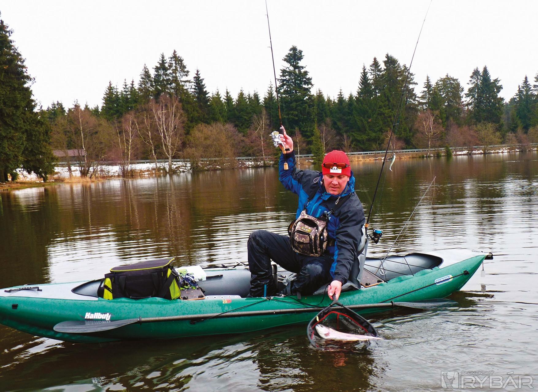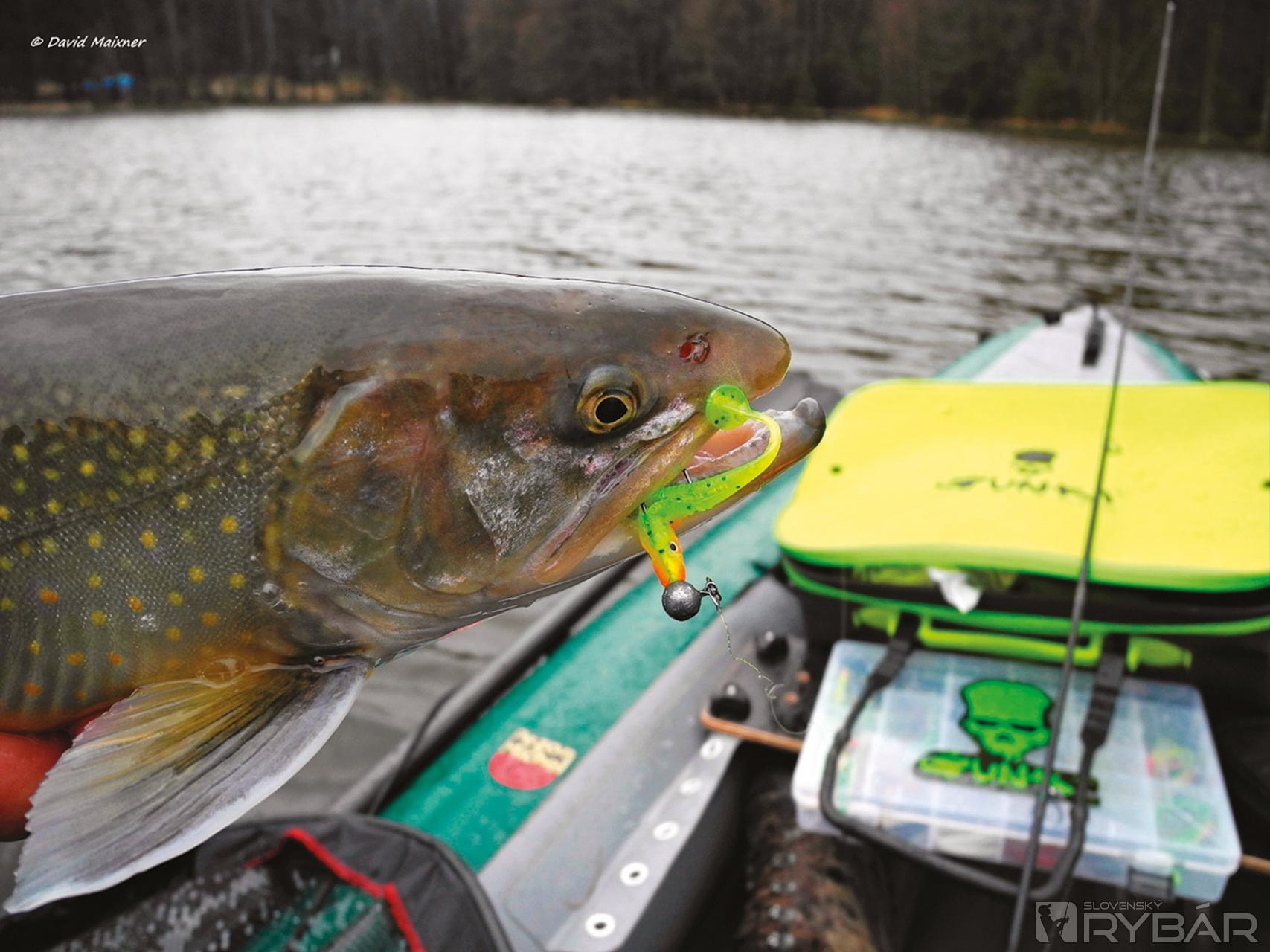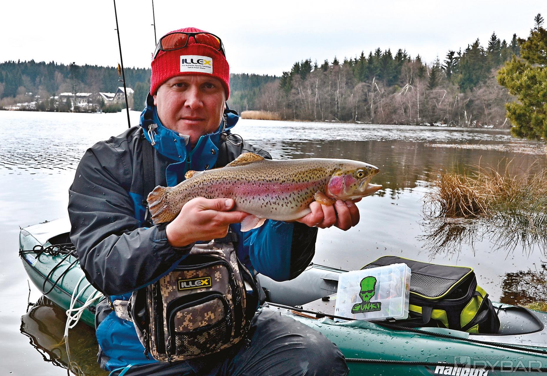 Na sklonku roka som sa posadil do nafukovacieho kajaku a začal brázdiť pstruhové jazerá a učil sa úplne iným zvyklostiam a pravidlám, než som poznal z boatu alebo loďky. Moje nadšenie bolo také veľké, že som sa prakticky nemohol dočkať, keď sa na jar jazerá roztopia a ja konečne vyplávam. Samozrejme, že som sa dočkal. A už vopred musím povedať, že celá jar bola famózna, plná krásnych a veľkých rýb, a hlavne nových poznatkov, ktoré sa mi hodia aj pri bežnom love. Aké lokality sú vhodné a ako hľadať miesta pre najlepší lov? Tak v prvom rade tu musí byť povolený lov z vody. Čo našťastie komerčné vody umožňujú. Určite sú lepšie väčšie vodné plochy, kde je na vode pokoj a nedochádza ku kontaktu s rybármi, ktorí lovia z brehu. Ak je nádrž s premenlivou hĺbkou a nie úplne plytká, tak nám umožňuje lov v podstatne dlhšom časovom období roka. To znamená, že s postupne otepľujúcu sa vodou dokážeme ryby hľadať v hlbšej a chladnejšej vode a ich aktivita je veľká už aj v teplom júni. Miesta na lov väčšinou skúsený rybár spozná. Avšak na novej lokalite je nutný aspoň malý prieskum nádrže. S kajakom sa nechávam unášať bez zakotvenia a praktickým lovom hĺbku dokážem slušne odhadnúť a rovnako tak aj prípadné terénne zlomy dna. Pochopiteľne, môžem si ľahko pomôcť aj sonarom. Priznám sa, že pri love pstruhov ho však príliš nepoužívam. Navyše po zakotvení sa väčšinou presvedčím o skutočnej hĺbke v danom mieste.