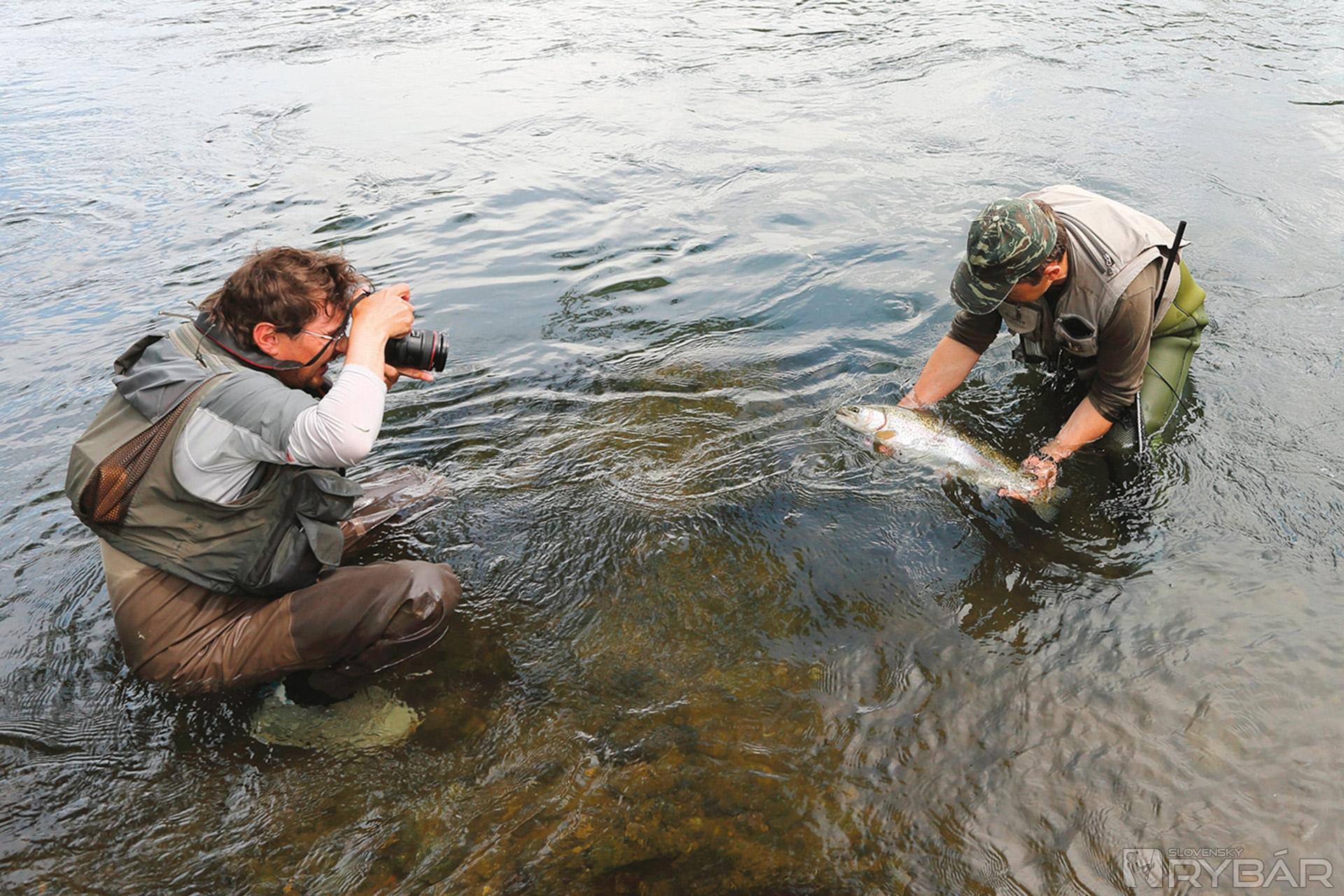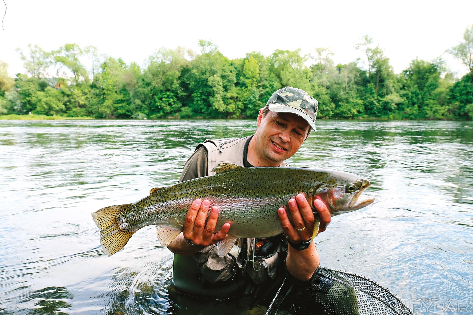 Pokračujeme v love. Skúšam vláčiť a po chvíli mám prvý záber. Vobler, vo farbe čereble, mi pri nohách berie pstruh potočný, niečo nad štyridsať centimetrov a zanedlho ešte jeden, trochu väčší. Ani ho nestačím zdolať, keď na mňa volá Miro, že má na udici ďalšieho krásneho pstruha dúhového. Vyberám fotoaparát a snažím sa zachytiť okamihy zdolávania tejto jedinečnej ryby. Pstruh robí niekoľko takmer metrových skokov, a tak je hneď jasné, s kým má rybár do činenia. Miro však nestráca rozvahu. Ubiehajú dlhé minúty náročného zdolávania, keď sa na rybe začínajú prejavovať prvé známky únavy. Zdá sa, že aj Miro má toho už dosť. Vydýchne si až keď ryba končí v podberáku. Ďalší krásny pstruh, do šesťdesiatky mu chýbajú len dva centimetre.