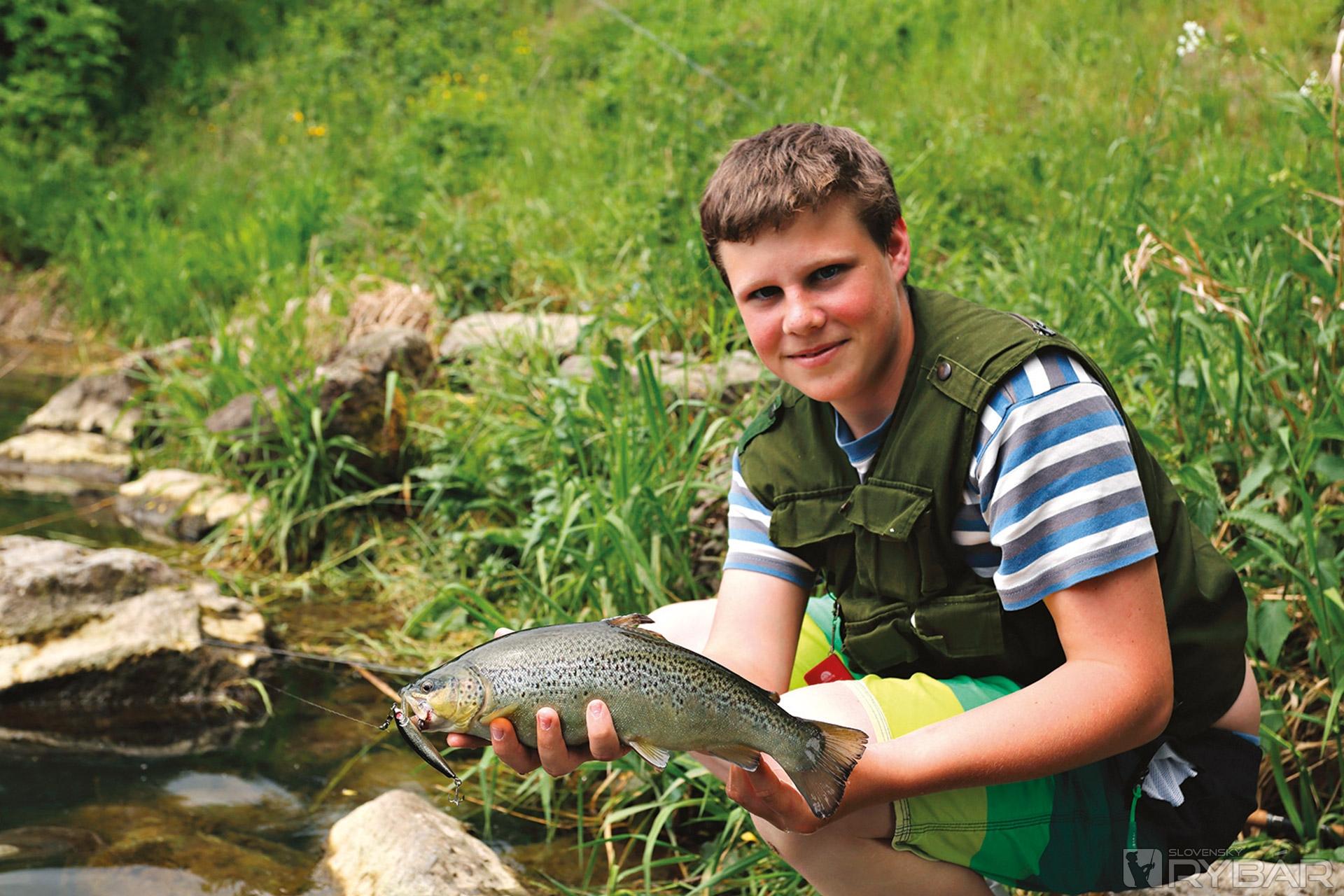 Chalani sú nadšení, teším sa s nimi. Lovíme ďalšie pekné ryby, len Matúšovi sa stále nedarí. Na prívlač nemá zatiaľ žiaden záber. Posielam ho teda vyššie, priamo pod most. Po chvíli už aj on má na udici prvého pstruha potočného. Z jamy pod mostom vytiahne ešte niekoľko bodkovaných krásavcov, väčšia ryba mu po záseku uniká.