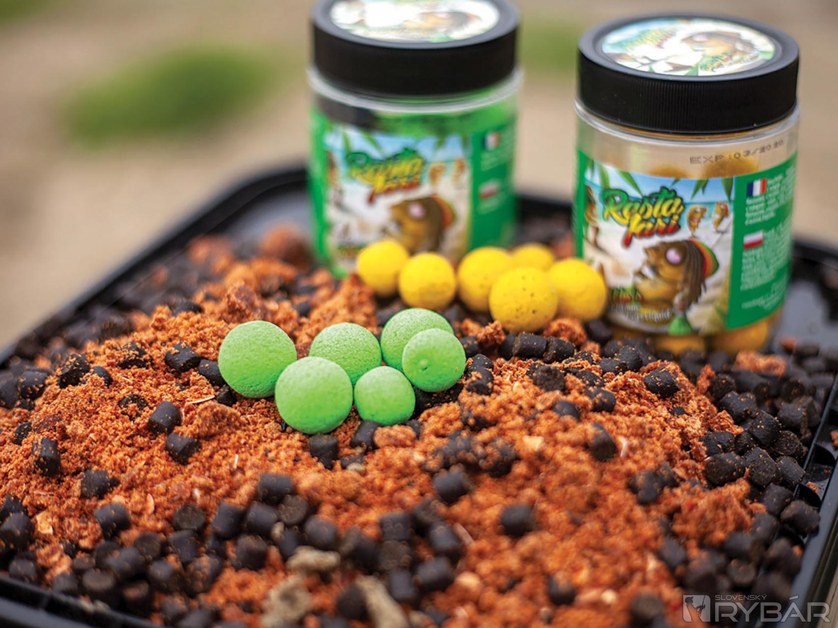 Pelety, drvené boilies a krmivo pripravené na kŕmenie a pop upky v rôznych farbách na háčik.