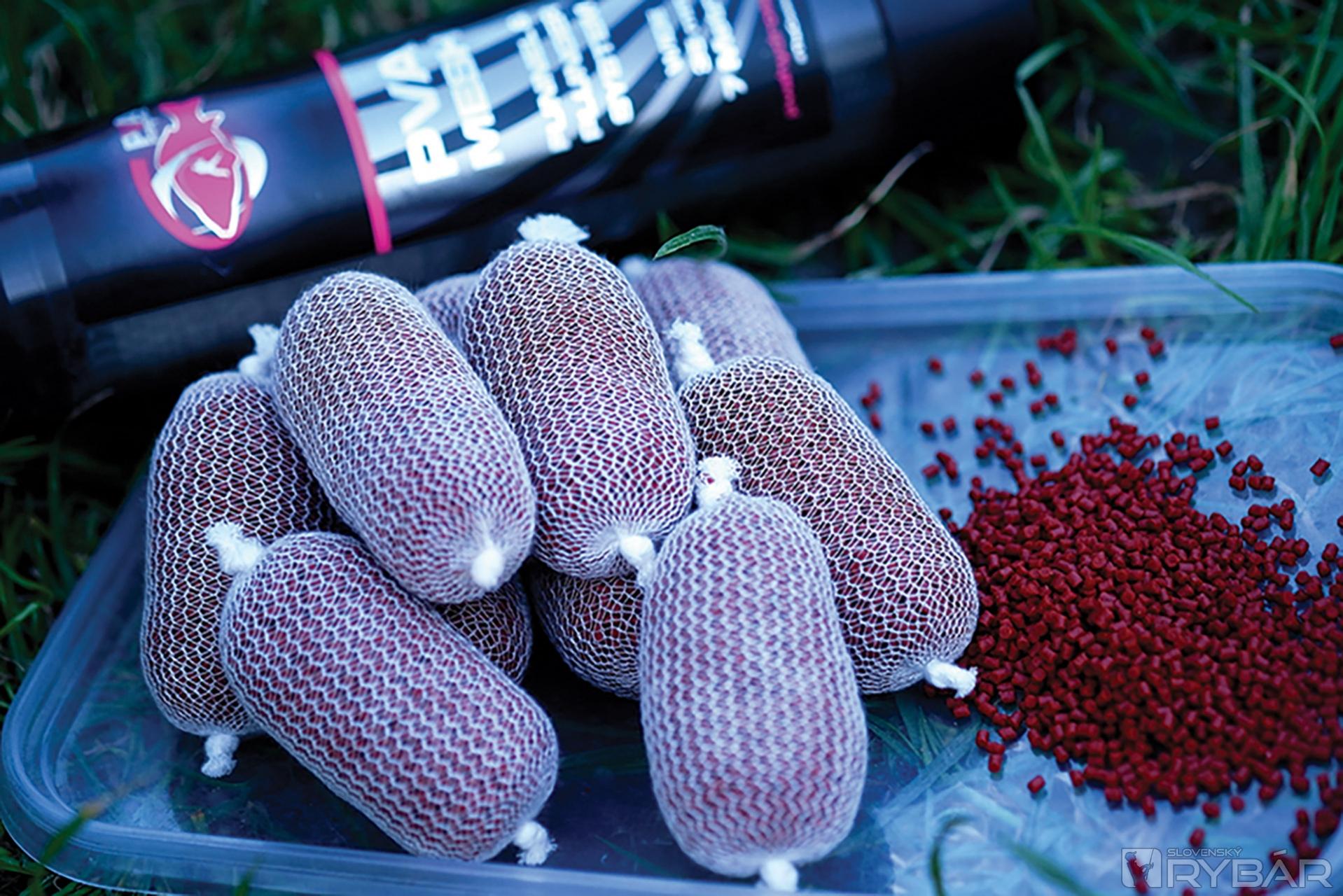 PVA pančuška naplnená peletkami pripravená na zakŕmenie.