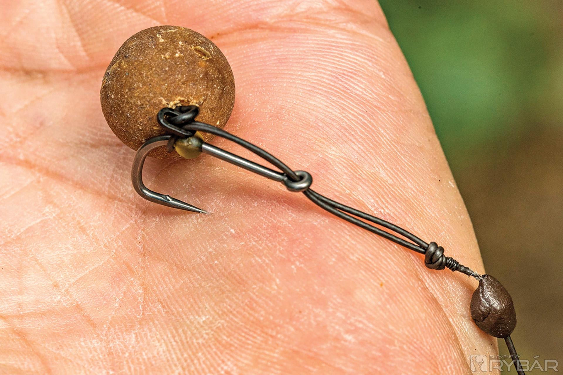 Ak chcem, aby nástraha správne sedela v hornej časti oblúčika, je potrebné zabrániť tomu, aby sa slučka zatiahla späť do očka háčika. To sa môže stať pri nahadzovaní, keď dopadne montáž do vody. Aj napriek tomu síce budete môcť na takto prezentovanú nástrahu niečo uloviť, ale určite nie s takým úspechom, ako keď je nástraha umiestnená v oblúčiku a má možnosť voľne sa pohybovať. Existujú rôzne spôsoby, ako udržať zdvojenú šnúrku v tvare „D“ pri ramienku háčika. Používam gumený 3 mm korálik (bore bead), ktorý umiestnim na začiatok oblúčika háčika. Horná časť slučky si tak drží tvar a nepohne ním ani nástraha pri dopade na hladinu. Videl som, ako iní používajú zmršťovaciu hadičku cez očko háčika, aby urobili to isté, ale ako som zistil, korálik je najjednoduchší spôsob. Jediný problém nastáva pri použití PVA pančušiek. Normálne by ste ich zavesili na háčik, ale to môže poskytnúť príliš veľký odpor pri dopade na hladinu a potiahnuť slučku aj s korálikom. Ak lovím s PVA pančuškami, tak ich priväzujem k samotnému olovu. Prípadne prejdem na inú montáž ako Ronnie alebo Slip D.