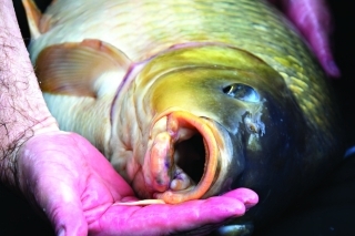 Prvého záberu sa dočkal Romanko po piatich minútach od nahodenia. Ryba zabrala razantne a z cievky navijaka si pýtala vlasec, ale Romanko je už zručný rybár, tak si zachoval pokoj a pekne, opatrne zdolal krásneho kapra s hmotnosťou okolo 8 kg. Pri fotení som spozoroval, že sa mi ohýba prút, nuž som rýchlo zasekol a začal som aj ja zdolávať rybu. Protivník bol bojovný a cítil som na prúte aj poriadnu váhu a silu, nuž som tipoval, že to asi bude kapor nad 10 kg a zhruba po 10 minútach sa to aj potvrdilo. Mojím protivníkom bol krásny kapor s veľkou papuľou, kde som musel hľadať svoj háčik.