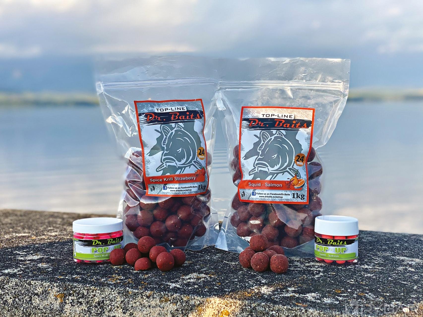 Ako kŕmenie sme používali boilies radu Top line a Atract line s príchuťami Green Pearl a Big Black Crab, všetko vo veľkosti 24 mm s kombináciou pop‑up totožnej príchute.