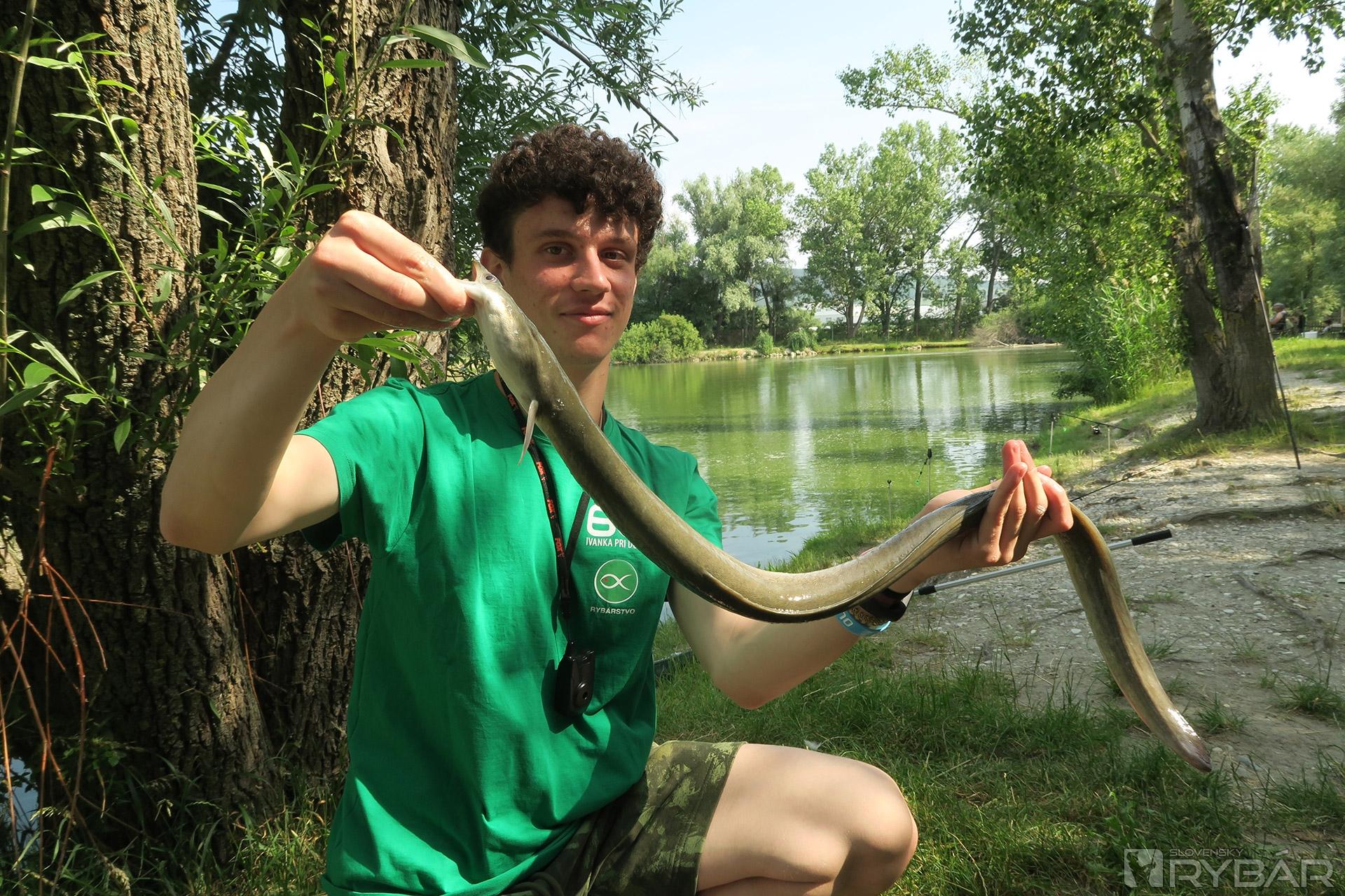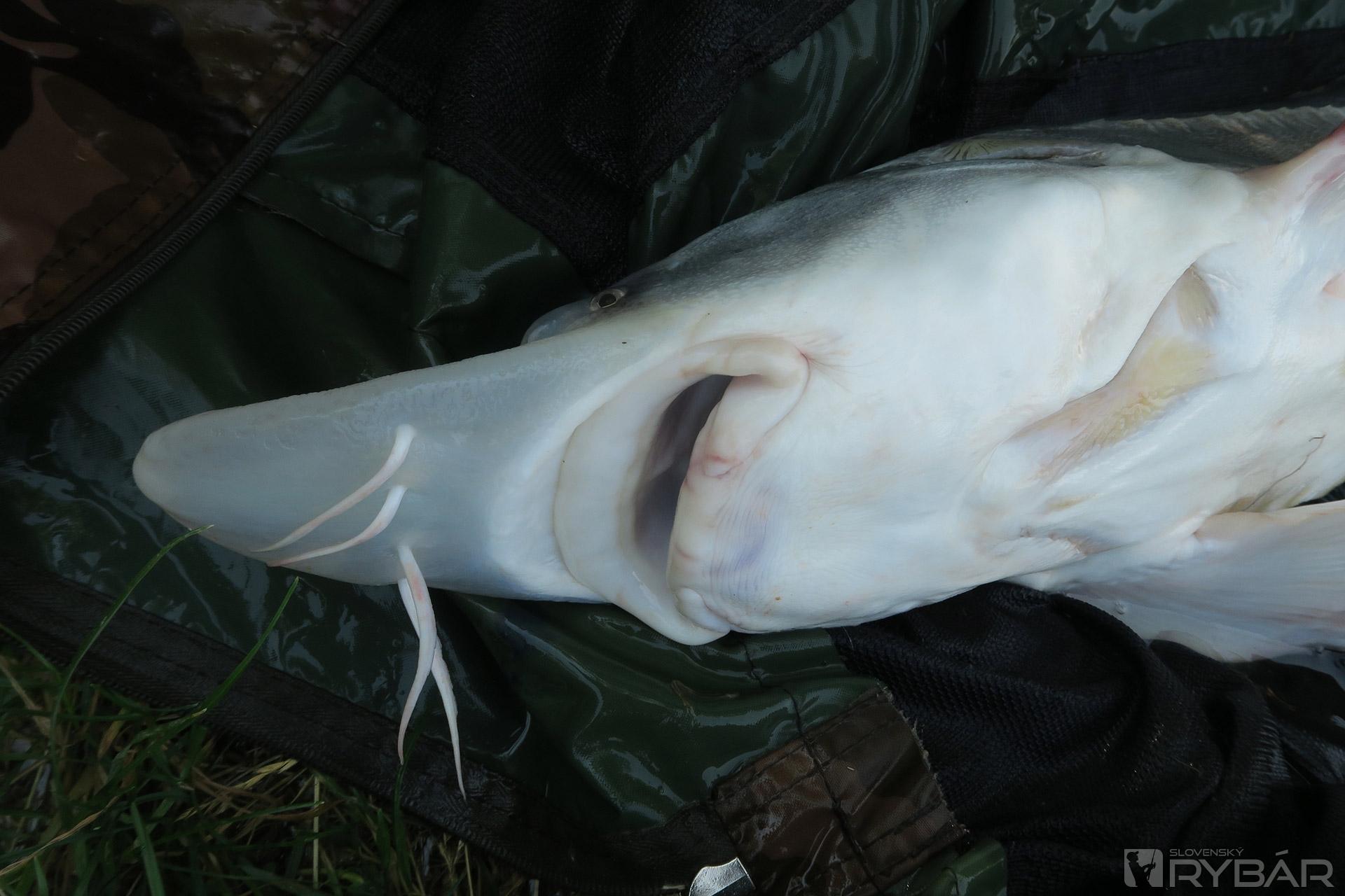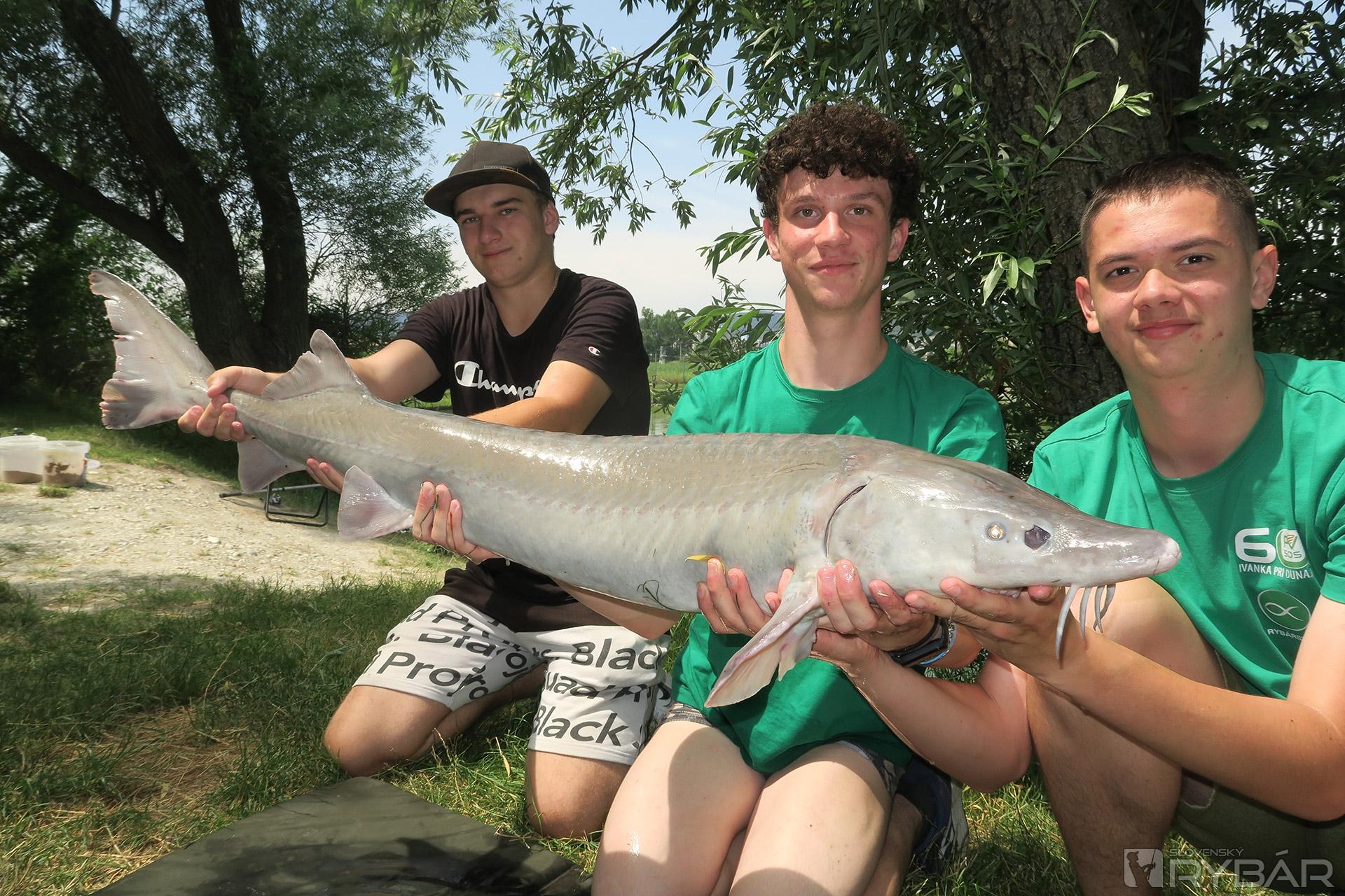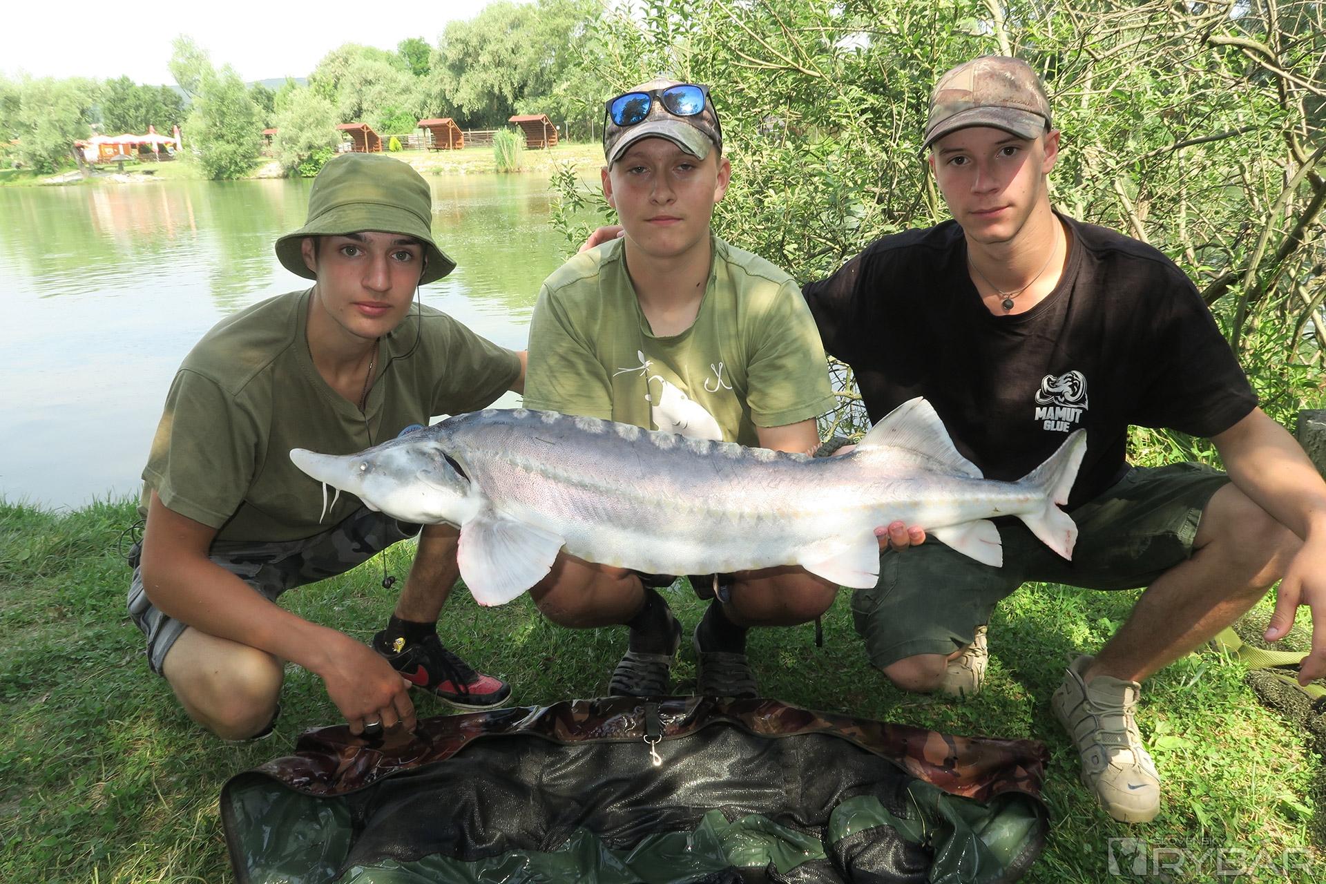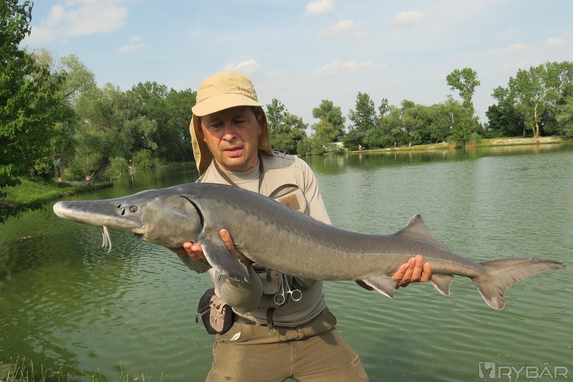 Konečne majú aj chlapci prvé zábery. Martin zdoláva niečo väčšie. Prichádzam na pomoc s podberákom, ale ryba sa zatiaľ na hladine neukázala. Je to väčší kapor alebo jeseter? Konečne sa na hladine objavujú víry veľkej ryby a keď zbadáme podlhovastý čierny chvost, tak je nám to jasné – jeseter a celkom slušný, určite cez meter. Bojuje vytrvalo, ale skúsený Martin ho po pár minútach dostáva do podberáka. Obdivujeme krásne stavanú silnú rybu. S predĺženou špicatou hlavou a ústami úplne naspodku vyzerá doslova exoticky. Krásneho jesetera púšťame a lovíme ďalej.