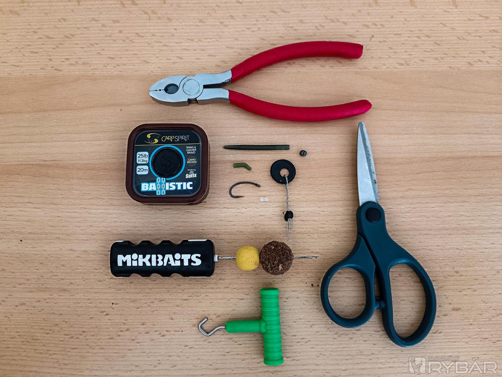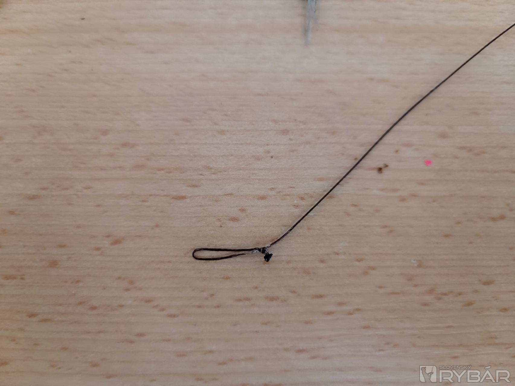 Na montáž som použil obyčajnú 25 lb šnúru, rovnátko, anti‑tangle hadičku, malý krúžok, háčik Curveshank od Foxu a malé olovko. Postup viazania je úplne jednoduchý: