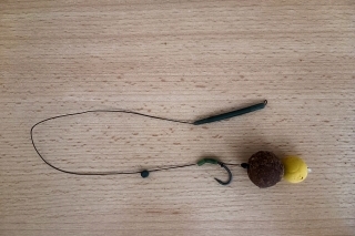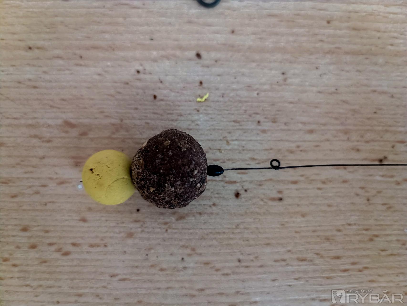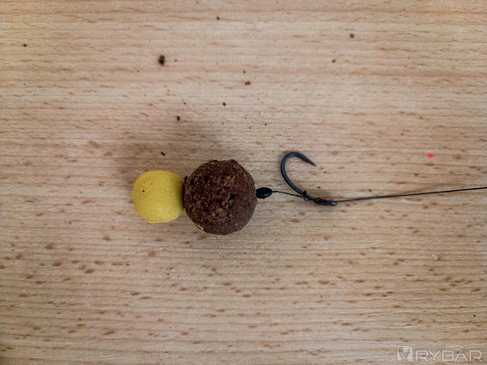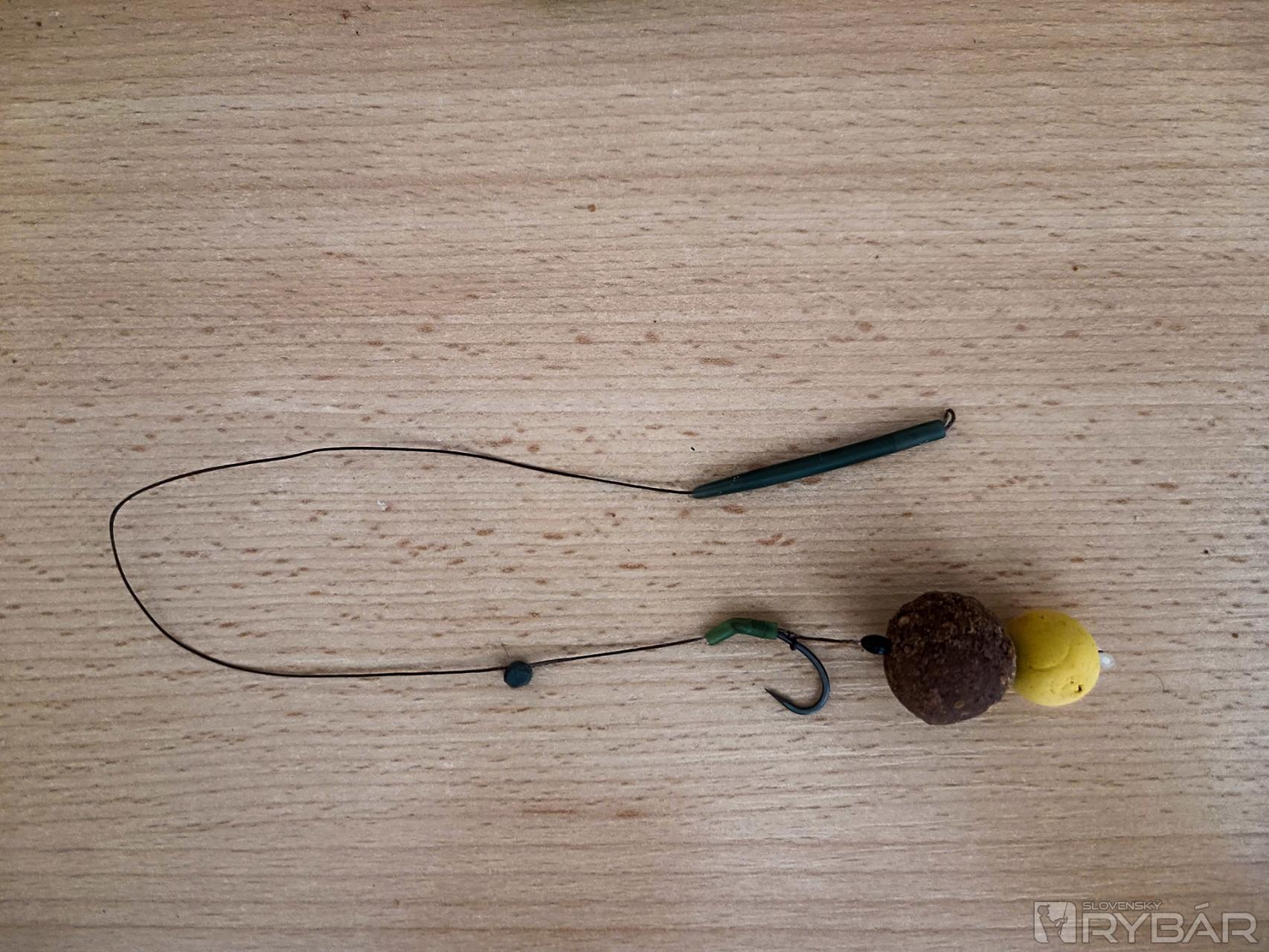 Ako prvé si spravíme malé očko, potom na šnúru navlečieme našu nástrahu, v mojom prípade to bola guľôčka Krill 20 mm s popkou Ananás NBA 14 mm. Keď už máme navlečené boilies, odstrihneme si 30 cm šnúry, na ktorú navlečieme malý krúžok a spravíme uzlík cca 1 cm od nástrahy a navlečieme háčik. Šesť až sedemkrát ovinieme a šnúru prevlečieme naspäť cez očko háčika a zatiahneme. Následne navlečieme na háčik rovnátko a hadičku anti‑tangle. Na druhom konci spravíme tiež malú slučku, ktorá slúži nato, aby sme vedeli rýchlo meniť montáže podľa potreby. Montáž máme takmer hotovú, už len malé olovko cca 4 cm od háčika a máme hotovú dokonalú zasekávaciu montáž.