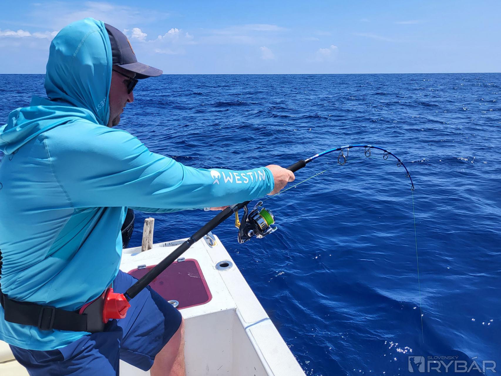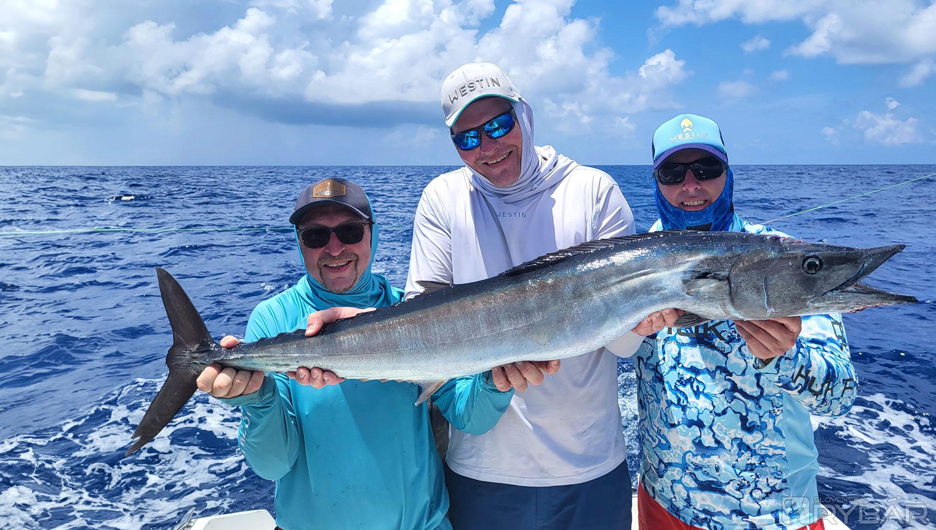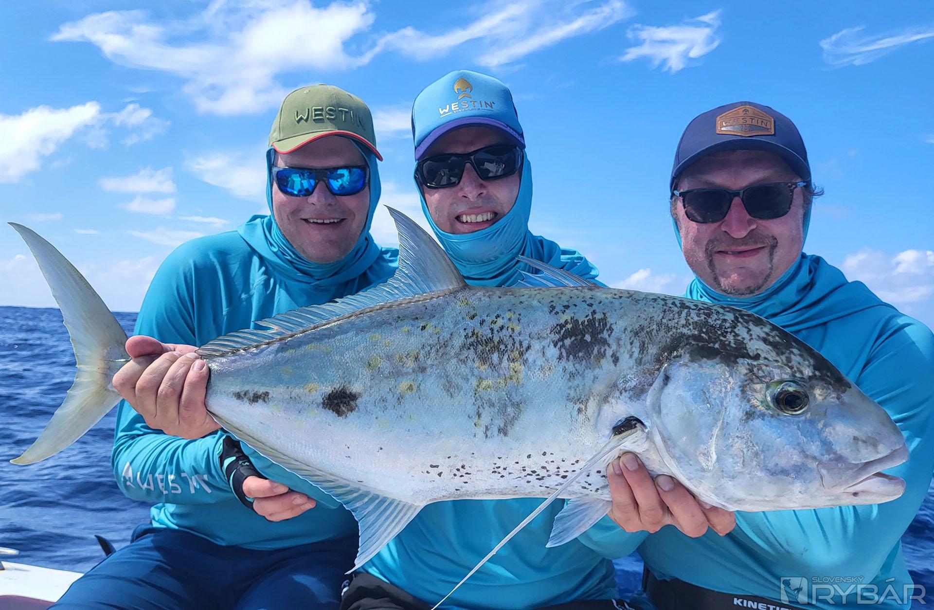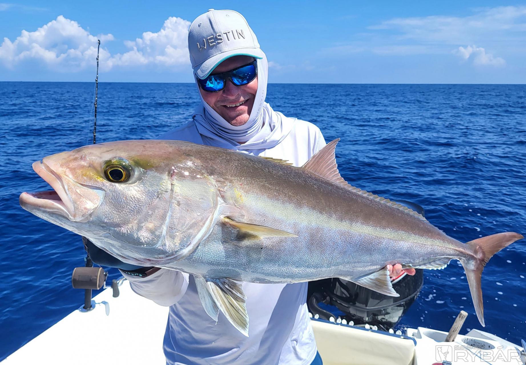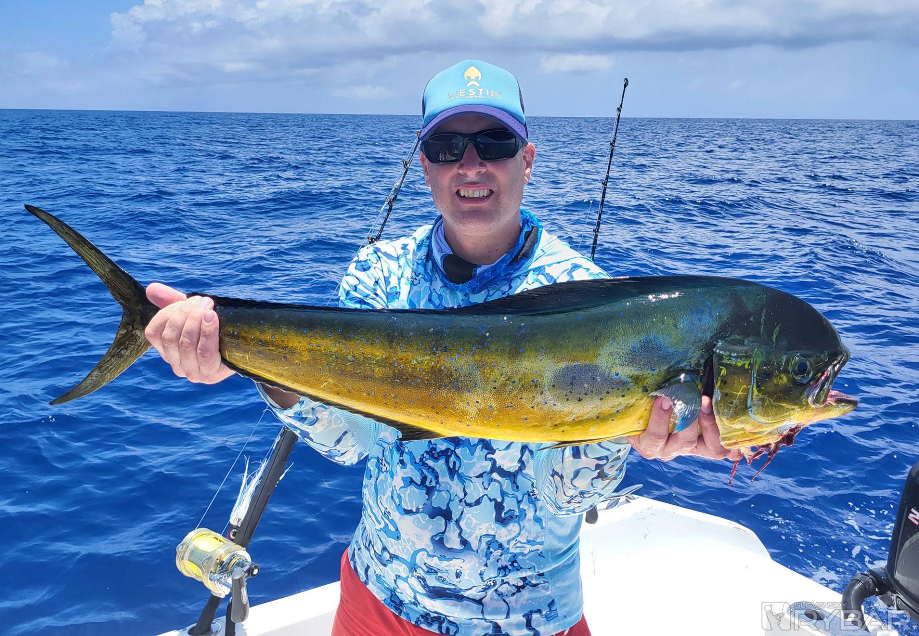 Keď začnete deň úlovkom približne 40 kg a 20 kg „doggieho“ na umelú nástrahu a nadviažete na to úlovkami 15+ kg amberjackov, nemôže byť deň zlý. Presne to sa nám pri prvých driftoch nášho tretieho dňa rybolovu podarilo. Užívali sme si tak vrcholné momenty tejto výpravy a najlepší deň, aký som kedy na teplom mori zažil. Nechýbali ďalšie chytené makrely jednofarebné, kranasy, kanice a ďalšie ryby. Majstrovský kúsok predvádza Honzo, keď zrazu vykríkne „Mahi-mahi!“ Rybu zazrel blysnúť sa vo vlne. Odhadzuje jiggingový prút, berie pripravený Westin W6 Popping so špeciálnym voblerom na „doráda“ a nahadzuje úplne iným smerom, ako rybu videl. Tá by sa totiž nahodením priamo na ňu vyplašila, ale týmto spôsobom na nástrahu útočí. A Honzo tak túto prekrásnu mahi-mahi zdoláva.