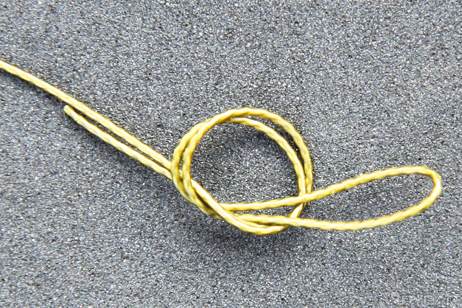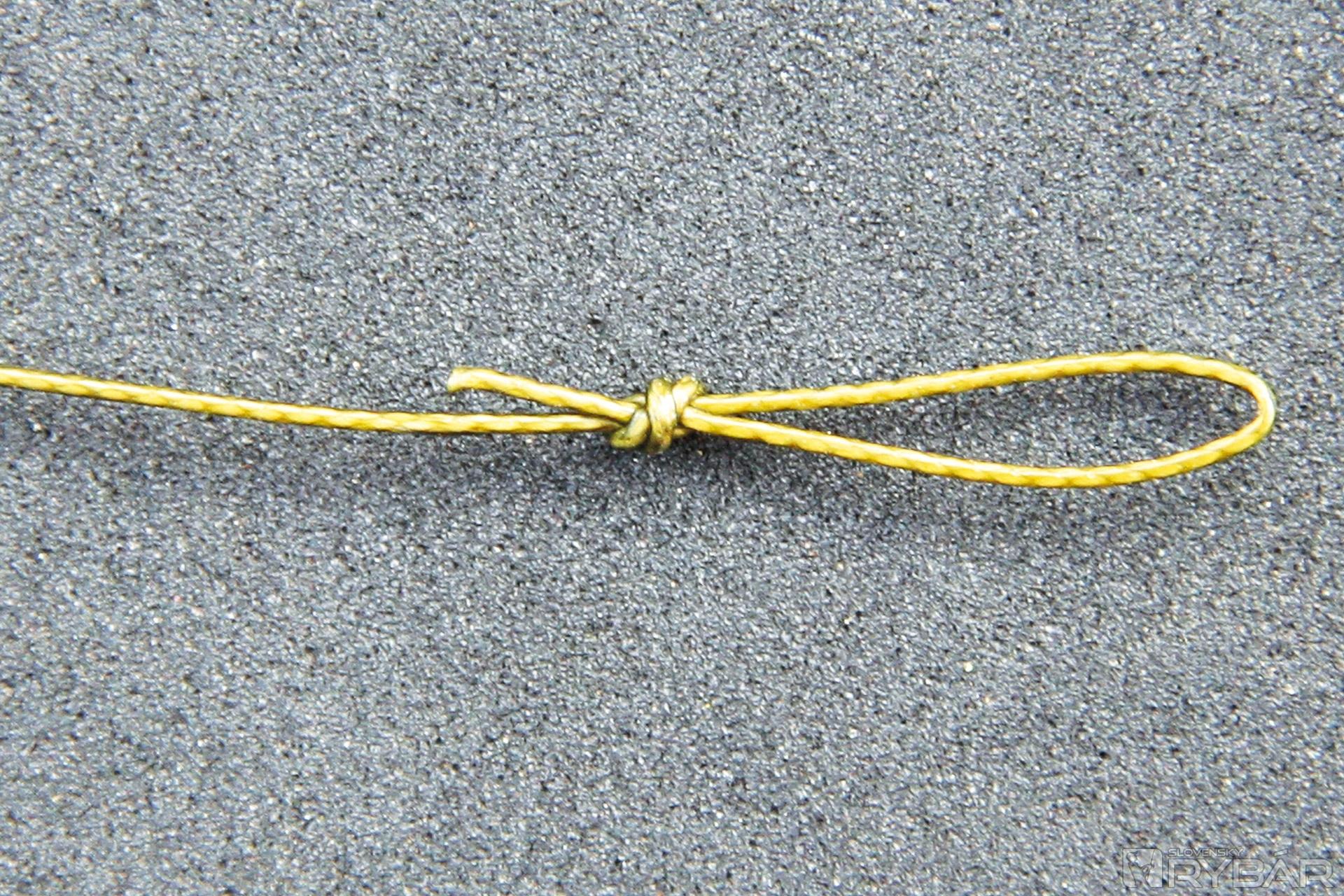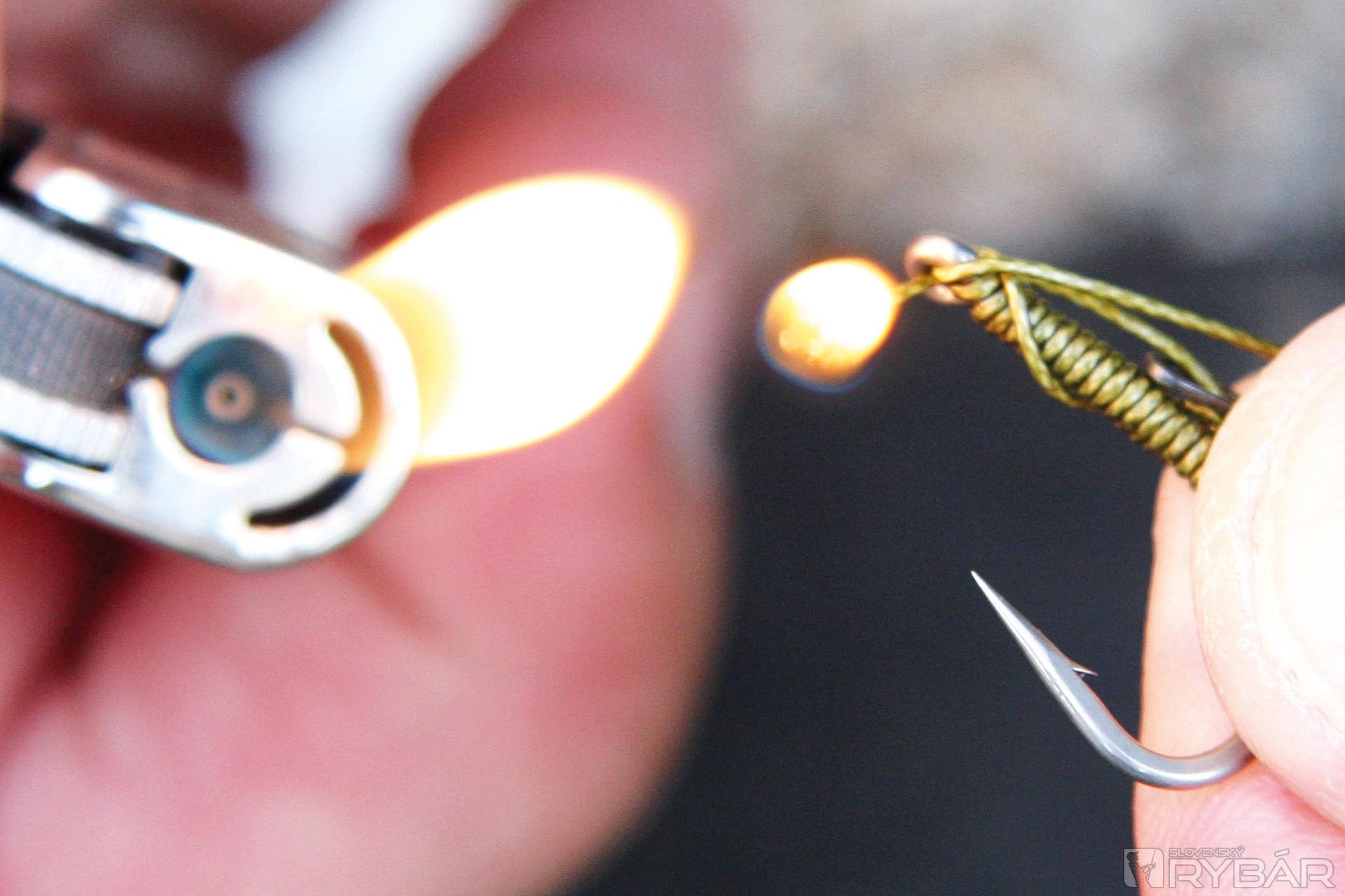6 Zapaľovačom skrátime dĺžku spletanej šnúry na požadovanú veľkosť a zároveň vytvoríme zarážku zabraňujúcu vyvlieknutiu sa šnúry z očka háčika.