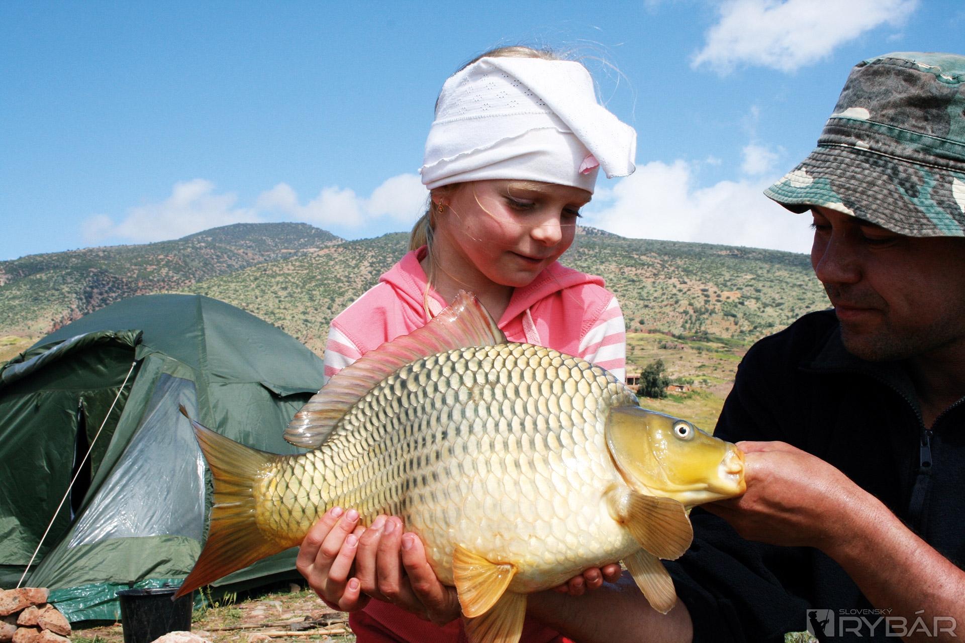 Trochu nechávame kapra odpočinúť vo vaničke a preberieme vhodnejšie pózy na fotenie, aby sa nemusela pasovať s takým ťažkým bremenom. Statočne bojuje, vraj ďalšia séria, a tak má pamiatku na celý život. A ak to bábätko nebude rybár, tak ja už neviem ako začať skôr so správnou rybárskou výchovou...