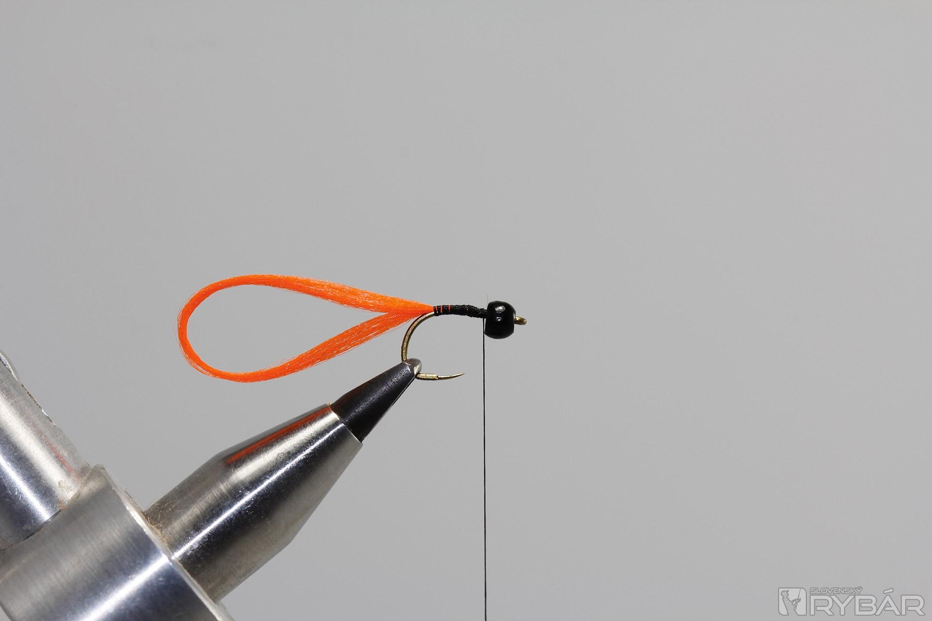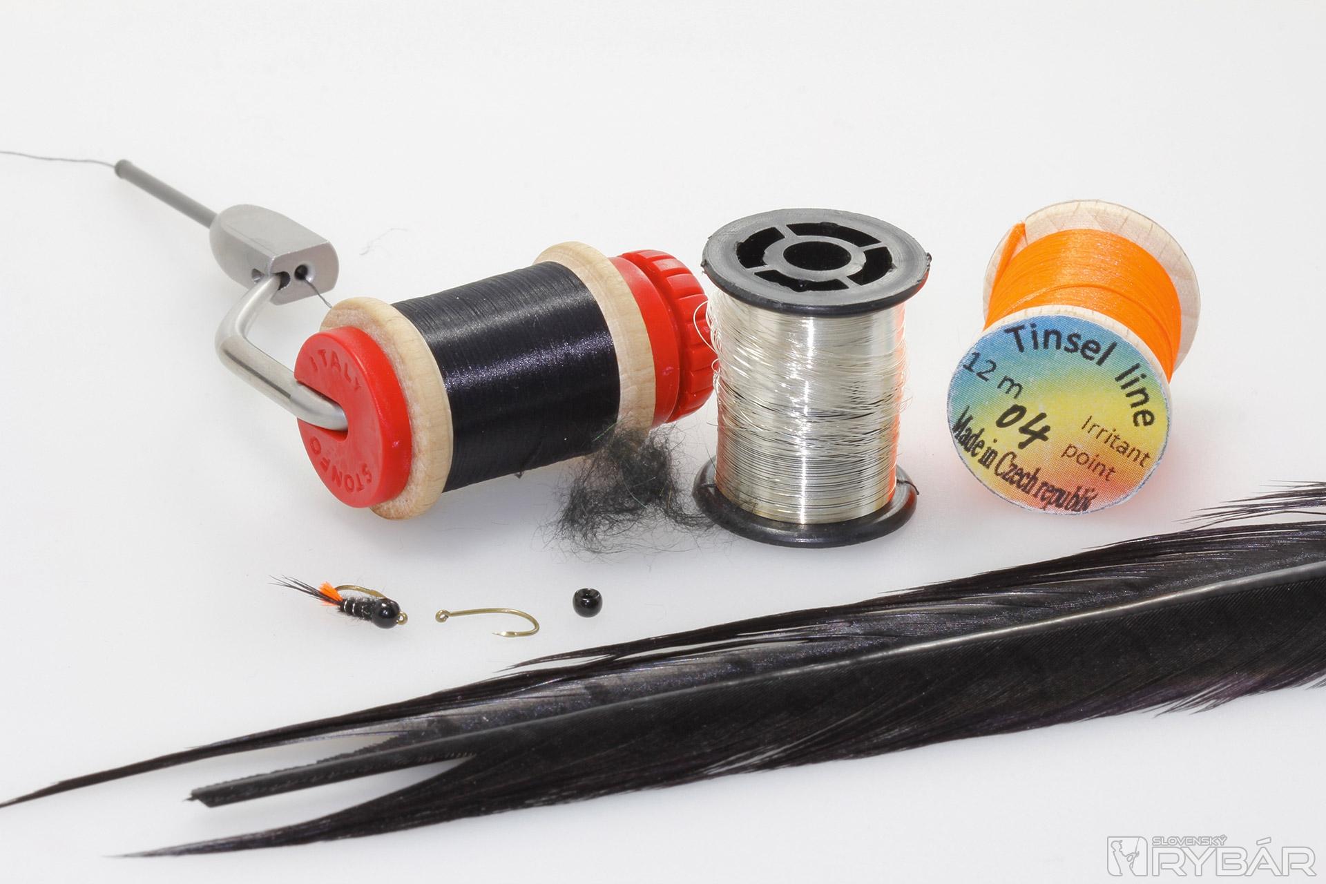 viazacia niť, čierne chvostové pero bažanta, oranžová hrubšia niť, tenký krúžkovací drôtik, čierny prírodný dabing