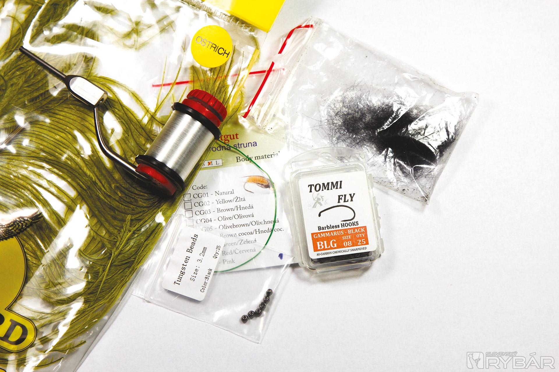 krivákový háčik, viazacia niť, volfrámová guľôčka, catgut – prírodná struna, pierko z pštrosa, čierna srsť z tuleňa.