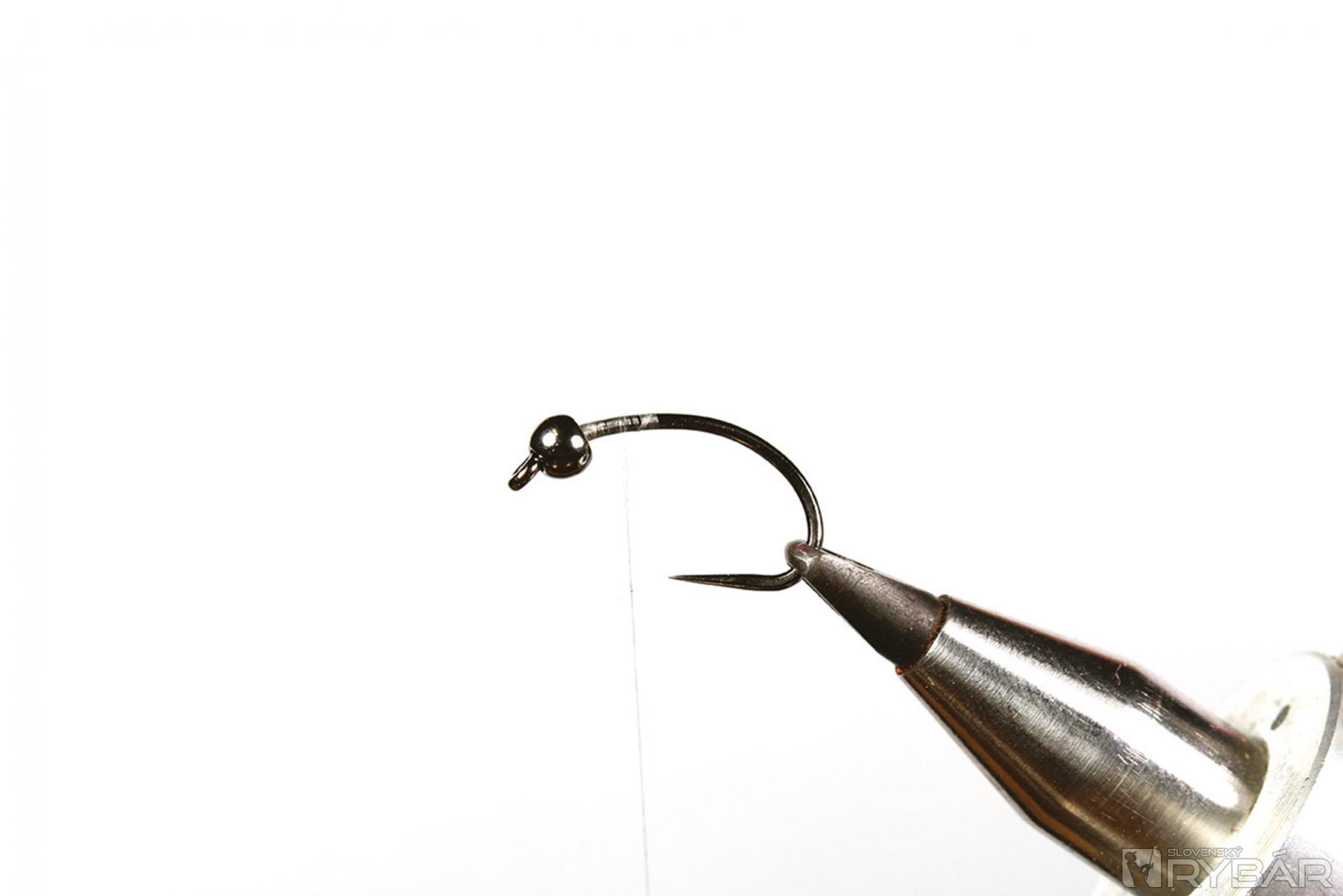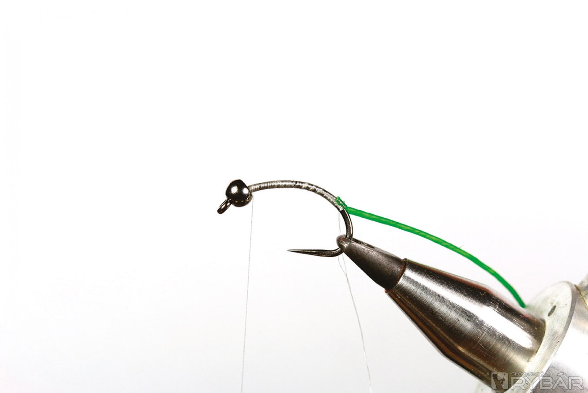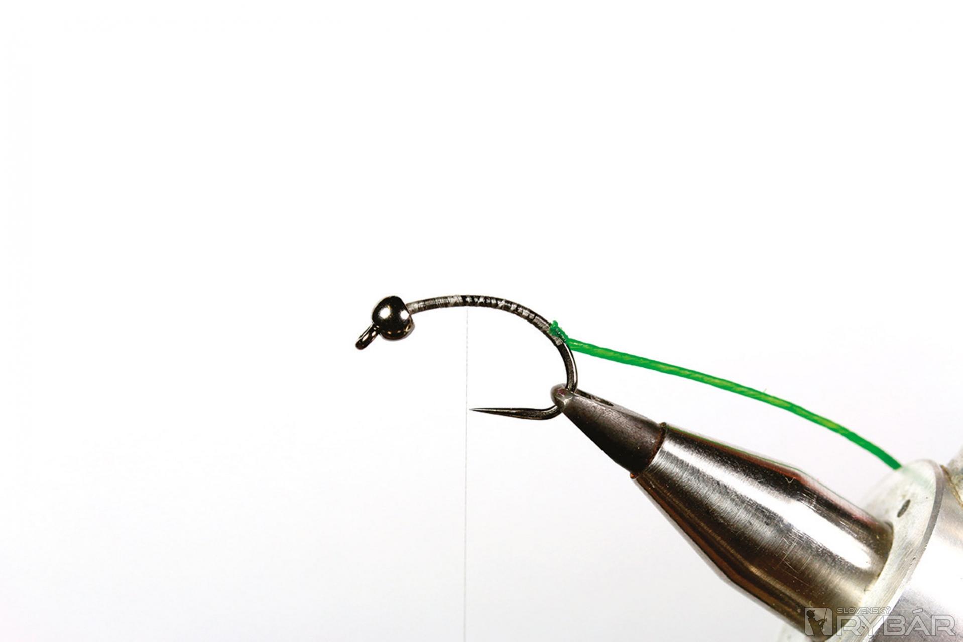 1. Na háčik navlečieme volfrámovú guľôčku, upneme ho do zveráčika a naviažeme viazaciu niť.