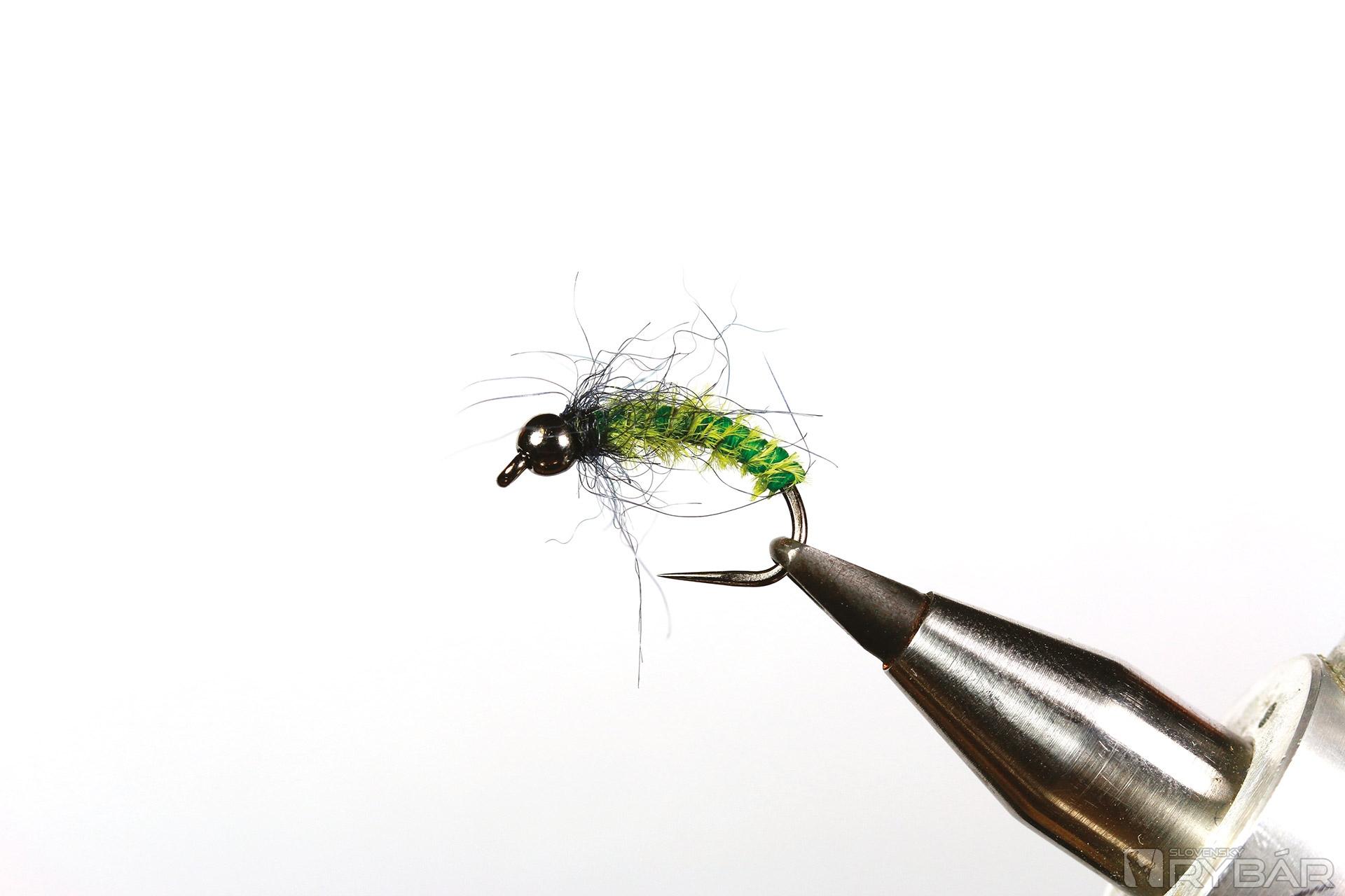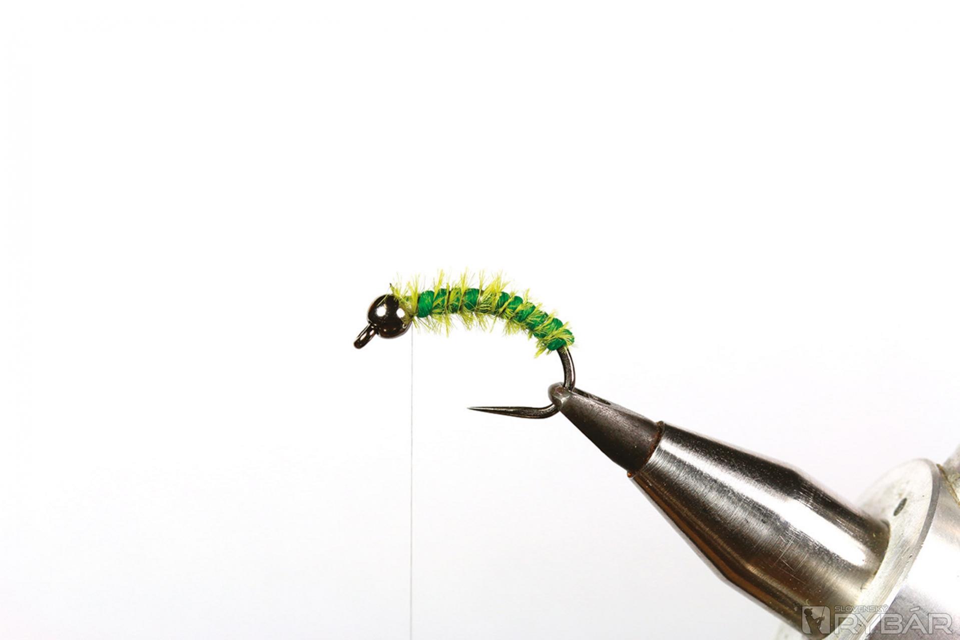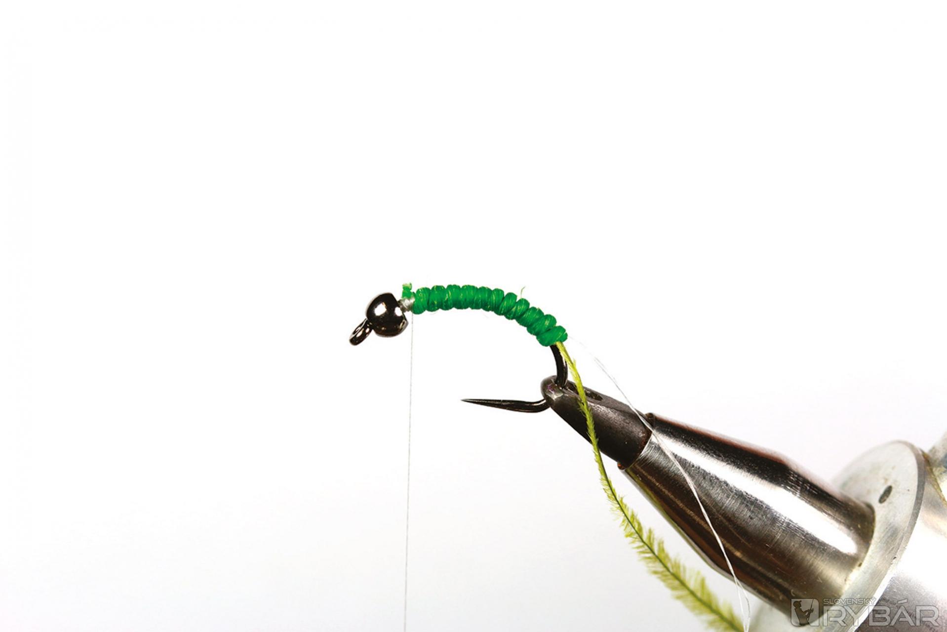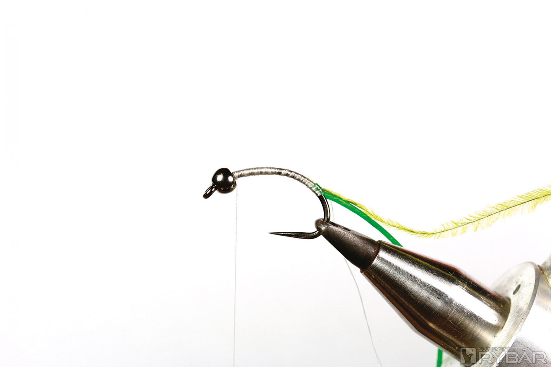 1. Na háčik navlečieme volfrámovú guľôčku, upneme ho do zveráčika a naviažeme viazaciu niť.