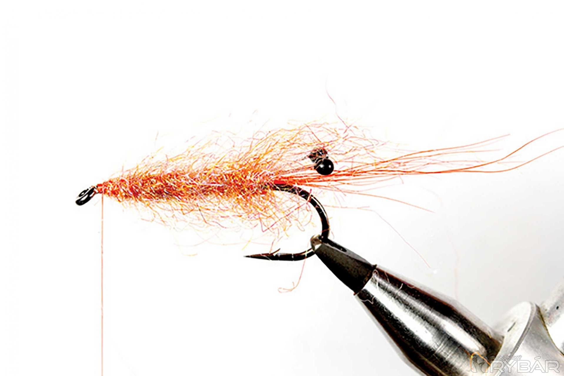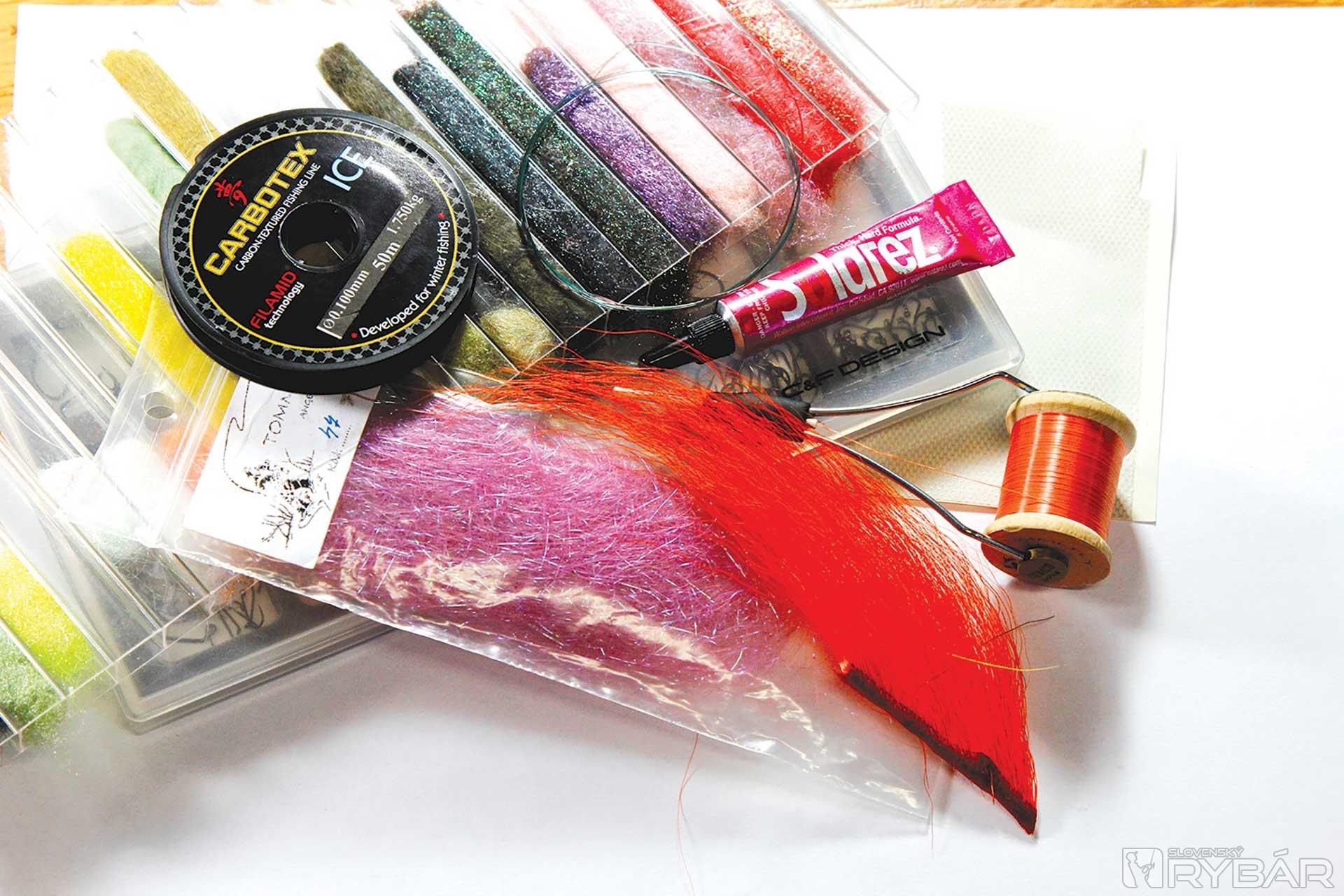 väčší háčik, oranžová niť, hrubší vlasec na oči, oranžová srsť „buck tail“, mix dabingu (oranžový, ružový, UV ružový, zelenkavý), chrbátiková fólia, vlasec
