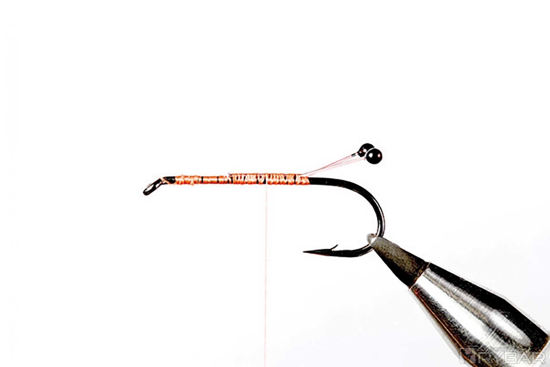2. Pridám pár prameňov oranžovej srsti „buck tail“ a naviažem krúžkovací vlasec.