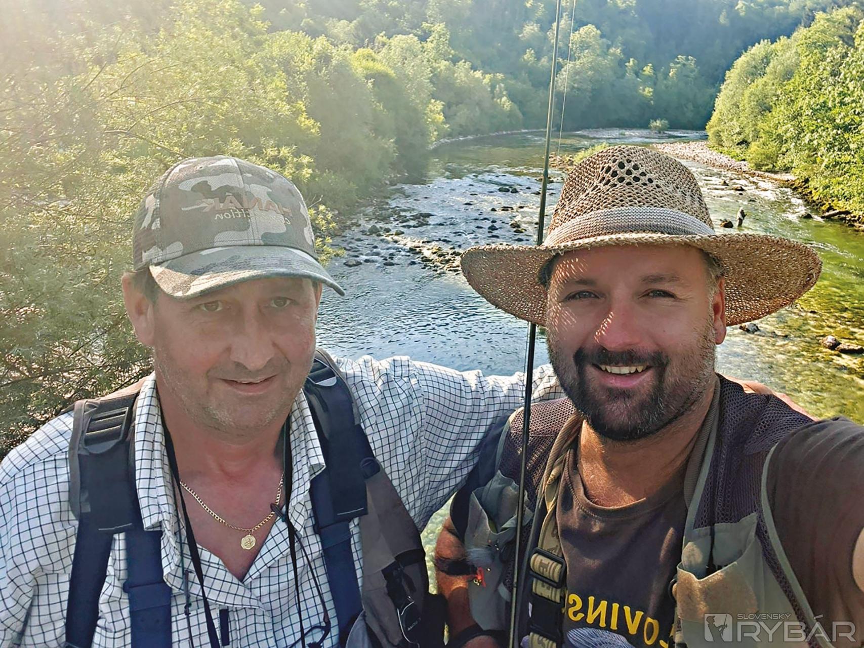 Chytáme len na malé nymfičky a na Slovinsko aj na veľmi jemný silon 0,10 mm. Tu je obrovská výhoda, že aj menšie ryby okolo 30 cm sú neuveriteľne bojovné. Každý je plný zážitkov a presúvame sa na úplný vrch, pod jazero. Tu sme sa rozdelili. Ja s Hanym som šiel do malej tiesňavy a David s Honzom na prúdy a veľkú jamu. V tiesňave sa nám darilo. Pridávali sme jednu rybku za druhou, ale veľkosť nepresiahla 35 cm. Prichádzame ku chalanom a tí sú na tom podobne ako my. Nastal čas zmeniť miesto a na záver dňa vyberám úplný koniec tohto revíru. Rieka je už trošku širšia a vodnatejšia. Tu sa nám konečne darí chytiť pár slušnejších rýb okolo 45 cm a množstvo malých. Prvý deň nám ubehol veľmi rýchlo a všetci toho máme plné zuby.