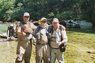 Všetci sú zo začiatku dňa nadšení, okrem Honza. Veľmi mu to nejde. Idem teda za ním, pozrieť sa, čo je zle. A už to vidím. Honzo si vzal krátky prút a nie je schopný s ním dlhý nadväzec správne vodiť. Požičiavam mu teda svoj prút a opäť vysvetľujem správnu techniku. Po chvíli prichádza jeden, druhý, tretí aj štvrtý pstruh. Aj Honzo je už teraz spokojný a ja velím na prejazd na iné miesto, kde je tiež posedenie pre rybárov a tu si dáme aj obed. Zastavujeme pri starom kamennom moste. Tu sa vždy dajú pochytať krásne ryby. Delíme sa na dve skupiny. Ja s Honzom začínam okolo mosta a bráchovia idú na rybársky trek spodnej, pomalšej časti kaňonu. Majú pred sebou dobrých 5 km brodenia, s hĺbkou okolo pása medzi veľkými kameňmi. No do večera majú čo robiť. My s Honzom dávame jednu krajšiu rybu za druhou. Potočáky, dúhaky vo veľkostiach od 35 do 52 cm. Po dvoch hodinkách som už rybársky uspokojený a navrhujem, vydať sa po stopách ďalších hlavátok.