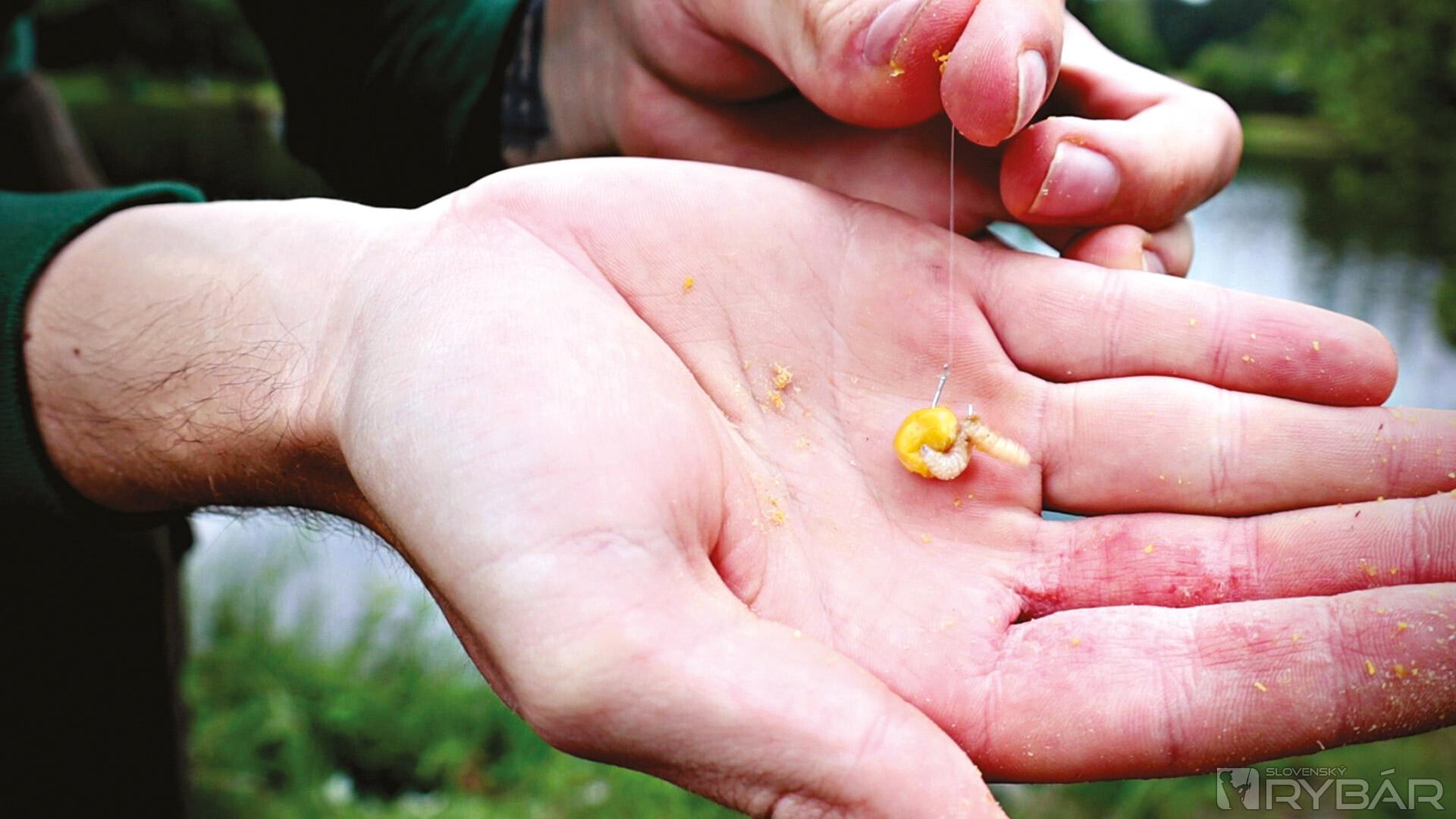 Ako nástrahu som nechcel dávať dážďovku, lebo viem, že na tomto revíri sú malé ostrieže. Preto moja idea bola staviť na chumáčik červov, ktorý v blízkosti sladkého kŕmenia vynikne a zaujme nejakého lieňa. Bohužiaľ, na začiatku prišli dve spomínané plotičky.