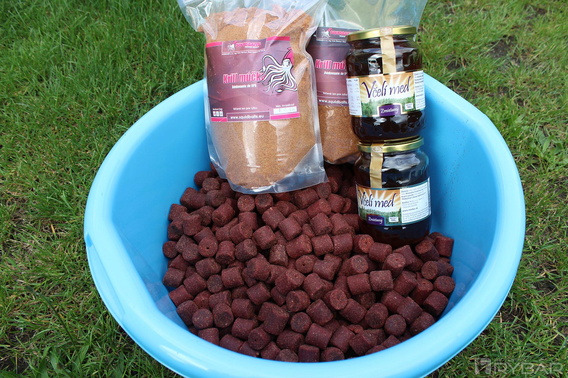 Krmivo si chystám na konkrétne miesto minimálne mesiac pred odchodom kvôli tomu, aby pelety a boilies dobre stiahli do seba všetky tekuté produkty. Boilies mi čerstvo naroluje a pripravuje Ing. Andrej Piš, PhD., zalievam ho aminokompletom, potom šup do mrazáka a vytiahnem ho až v deň odchodu. Boilies dávam do mrazáka, aby nesplesnivelo, lebo nie sú v ňom použité konzervanty ako v komerčných boilies. Pelety si chystám sám, tentoraz som stavil na red fisch, tie zalievam medom a potom zasypem krill múčkou. Občas ich premiešam, keď idem do garáže, na začiatku sezóny tam mávam takto nachystaných aj 80 kg peliet na rybolov.
