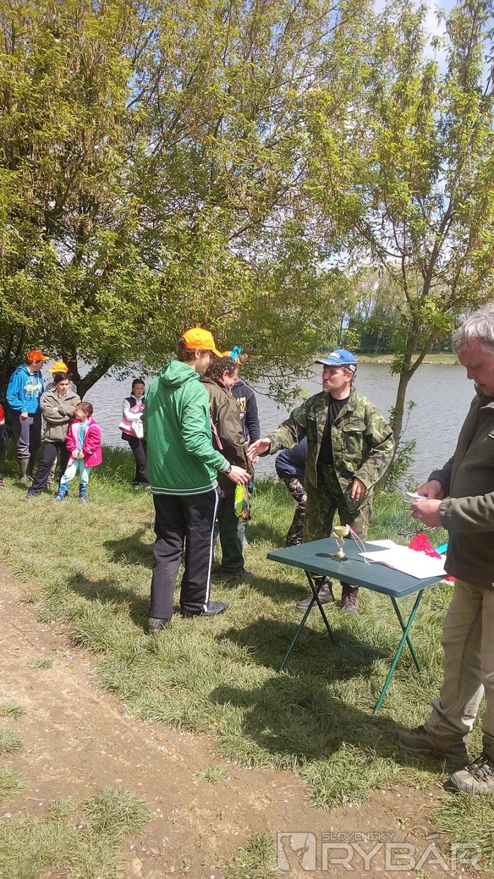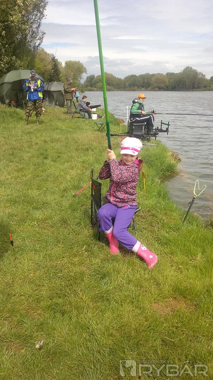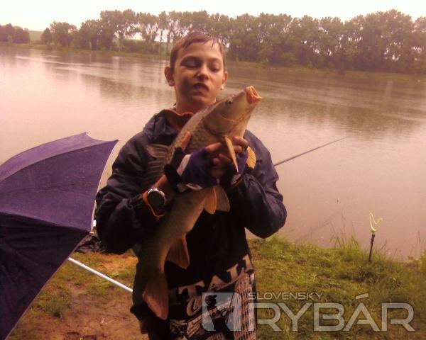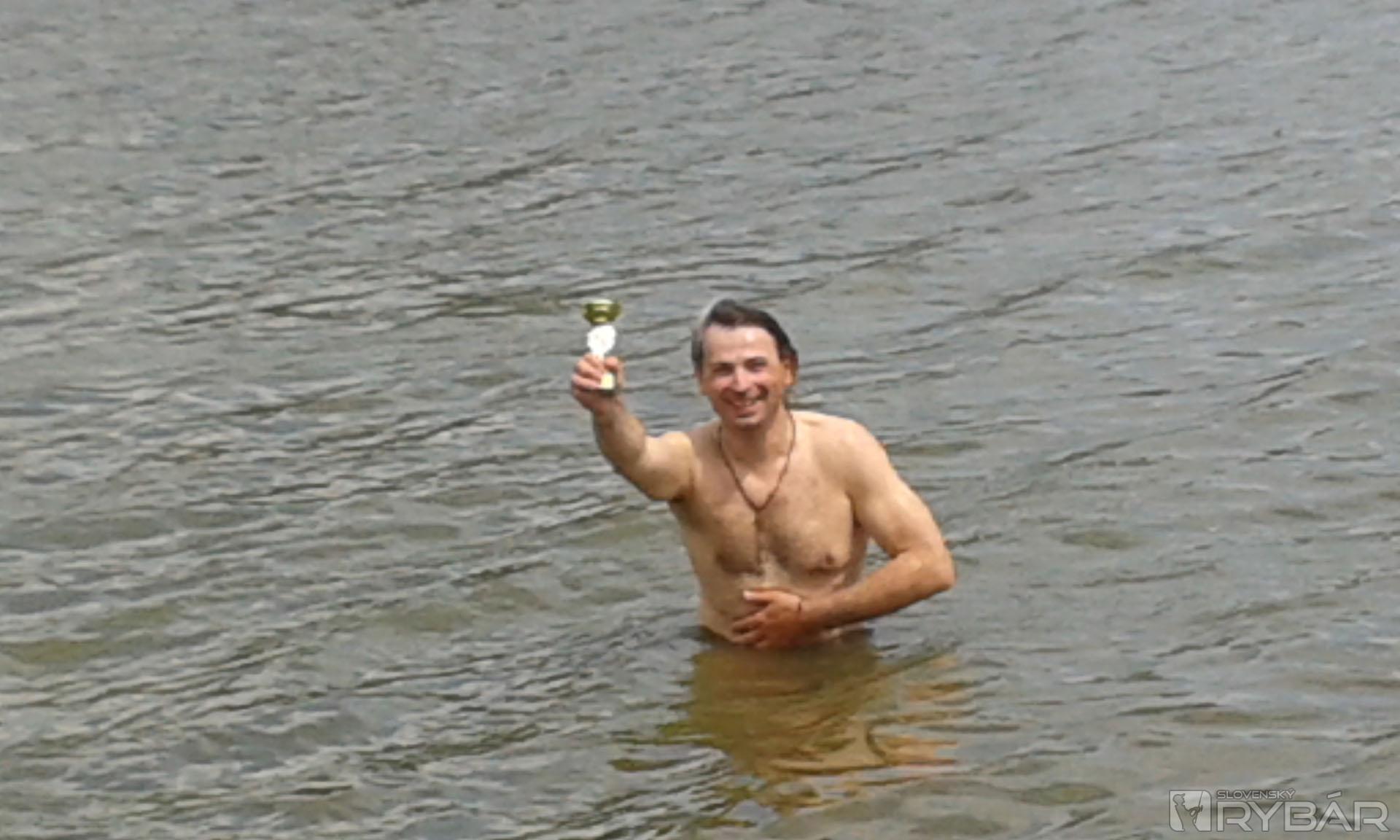 Nastal výstrel a preteky sa môžu začať. Nahádžeme krmivo, napichajú sa kostné červy so zrnkom kukurice a plavák letí do vody. Mizne pod hladinou a prvý kapor je tam, amortizér vyletí z biča a pomaličky kapríka unavuje. Nastáva meranie, potom druhé, tretie, zbieha sa celé vedenie našej Topoľčianskej rybárskej organizácie. Sledujú Jakubove umenie takmer celé preteky. Zdolávanie pekných rýb je predsa jeden z najkrajších zážitkov. Tesne pred obedom prestáva pršať, vykuklo nám aj slniečko, ale pridal sa však silný vietor. Dvanásta hodina sa blíži a tým aj koniec pretekov. Nastáva vyhlásenie výsledkov. Tajne dúfam, že ma skok do priehrady obíde. Stávku ale prehrávam na celej čiare, Jakub získava druhé miesto aj vďaka spoľahlivému biču od Shimana. Preberá ceny aj spolu s mladšou sestričkou, ktorá sa tiež zúčastnila pretekov. Hoci prišla chytať až po daždi, mama ju do lejaka nechcela pustiť, aj tak sa jej podarilo chytiť 22 rýb. Ak sa bude chcieť v budúcnosti staviť aj ona, tak ja už určite nebudem súhlasiť. A ako som teda dopadol Ja? Tak to je hádam dobre vidieť na fotkách. Synáčik hneď využil príležitosť, nafotil ma a zavesil fotografie na facebook. To je dnes vraj v móde. Sľub je sľub, a tak mi neostáva iné len pekne krásne hlboký nádych a už letím z hrádze do našej priehrady.