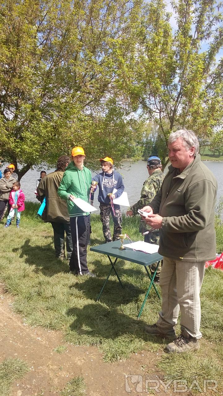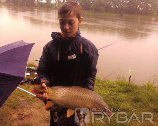 Nastal výstrel a preteky sa môžu začať. Nahádžeme krmivo, napichajú sa kostné červy so zrnkom kukurice a plavák letí do vody. Mizne pod hladinou a prvý kapor je tam, amortizér vyletí z biča a pomaličky kapríka unavuje. Nastáva meranie, potom druhé, tretie, zbieha sa celé vedenie našej Topoľčianskej rybárskej organizácie. Sledujú Jakubove umenie takmer celé preteky. Zdolávanie pekných rýb je predsa jeden z najkrajších zážitkov. Tesne pred obedom prestáva pršať, vykuklo nám aj slniečko, ale pridal sa však silný vietor. Dvanásta hodina sa blíži a tým aj koniec pretekov. Nastáva vyhlásenie výsledkov. Tajne dúfam, že ma skok do priehrady obíde. Stávku ale prehrávam na celej čiare, Jakub získava druhé miesto aj vďaka spoľahlivému biču od Shimana. Preberá ceny aj spolu s mladšou sestričkou, ktorá sa tiež zúčastnila pretekov. Hoci prišla chytať až po daždi, mama ju do lejaka nechcela pustiť, aj tak sa jej podarilo chytiť 22 rýb. Ak sa bude chcieť v budúcnosti staviť aj ona, tak ja už určite nebudem súhlasiť. A ako som teda dopadol Ja? Tak to je hádam dobre vidieť na fotkách. Synáčik hneď využil príležitosť, nafotil ma a zavesil fotografie na facebook. To je dnes vraj v móde. Sľub je sľub, a tak mi neostáva iné len pekne krásne hlboký nádych a už letím z hrádze do našej priehrady.